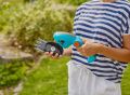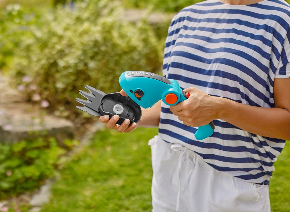 Contacteer onsDe Accu Gras- & Buxusschaar ComfortCut Li van GARDENA is ideaal voor het nauwkeurig maaien van gazonranden en het snoeien van struiken of kleine heggen. De set bestaat uit een blad van 8 cm breedte voor het knippen van gras, en een blad van 12 cm lengte voor het snoeien van struiken. De fijngeslepen kwaliteitsmessen met antikleeflaag blijven lang scherp en zorgen voor snelle en nauwkeurige sneden. Het grasmes is in Duitsland vervaardigd. De handgreep van de accugrasschaar en -buxusschaar is ergonomisch en kan worden gekanteld om hem aan te passen aan de natuurlijke houding van de hand. Dit maakt de schaar erg comfortabel te gebruiken en gemakkelijk te sturen. Het lage gewicht van de grasschaar en buxusschaar van slechts 600 gram helpt vermoeidheid te voorkomen. Alles wat je hoeft te doen is op een knop aan de zijkant van de behuizing drukken om de bladen te verwisselen. Zo wordt het blad ontkoppeld en kan hij verwijderd en vervangen worden. Wanneer volledig opgeladen gaat de krachtige accu van de grasschaar en buxusschaar 80 minuten mee. Vervolgens laad je hem op met de inbegrepen USB-C-kabel. De accustatus is zichtbaar op het led-display. Met de apart verkrijgbare telescopische steel met wielen (art. nr. 9859-20) kan je snoeien vanuit een rechte houding, zonder te bukken.