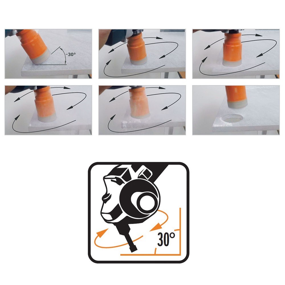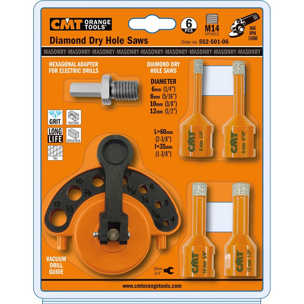 Contacteer ons6-delige set DP diamant droogboor voor marmer, graniet, keramisch voorzien voor een M14 haakseslijper + vacum boorgeleider met 7 gaten namelijk voor 4, 5, 6, 7, 8, 10 en 12mm. Deze set bevat volgende artikelen: 552-506, 552-008, 552-010, 552-012, 552-Guide, 552-EX14