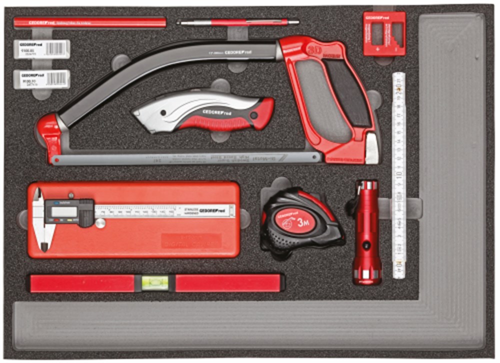 Digitale schuifmaatProfessioneel afbreekmes met 5 reservemessen 175 mm Rolbandmaat 3 m(De)magnetiseerblokMultifunctionele zaag 300 mm Waterpas 300 mm Duimstok hout 2 mTimm ermanspotlood 175 mm Hardmetalen kraspen 145 mm LED-zaklamp 130 mm