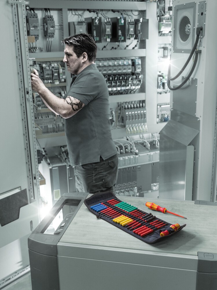 26-delige Kraftform Kompakt VDE set, 2 handhouders 817 VDE Kraftform, 24 VDE wisselklingen (elk 157 mm lang) grotendeels met gereduceerde klingdiameter (iS), om ook diepliggende schroeven en veerelementen te kunnen bereiken en bewerken. Individueel getest conform IEC 60900 bij 10.000 V voor veilig werken bij de toegelaten spanning van 1.000 V. "Take it easy tool finder" met kleurcodering op profiel en ingelaserde maatcode - voor het eenvoudig en snel vinden van het benodigde gereedschap. Kraftform Plus handgreep om prettig en ergonomisch verantwoord te kunnen werken en blaren en schuurplekken te voorkomen. Harde gripzones voor een hoge werksnelheid, zachte gripzones voor een hoge draaimomentoverbrenging. De wegrolbescherming verhindert telkens wegrollen op de werkplek.