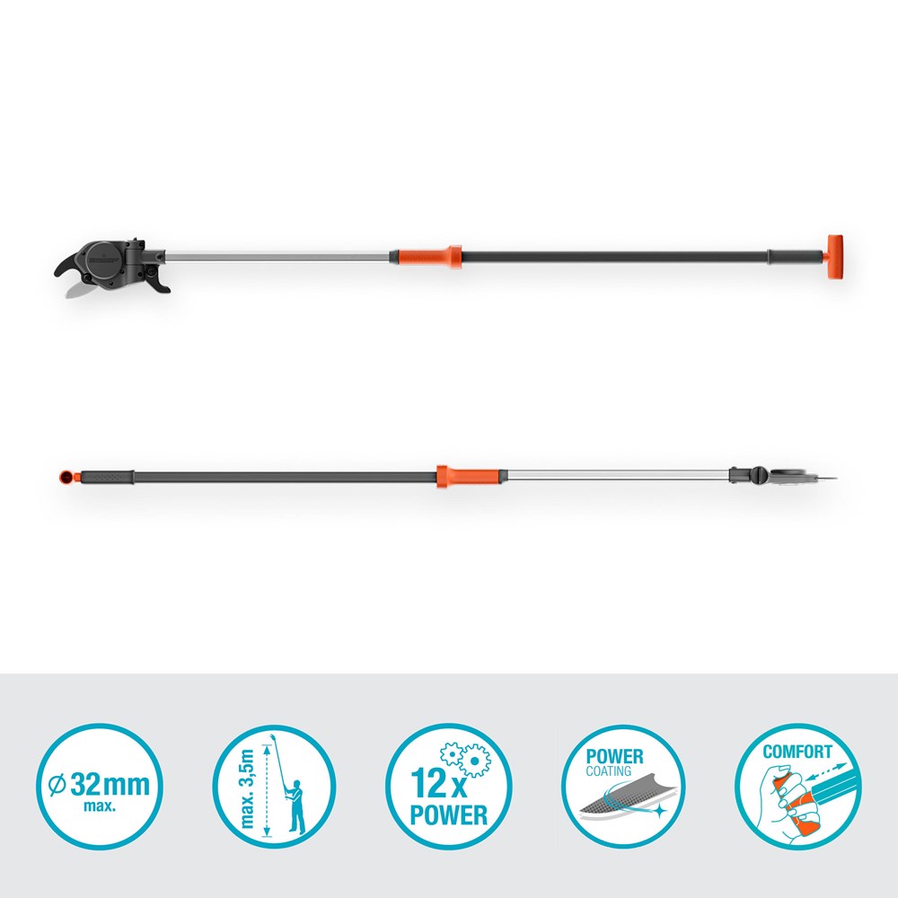 Contacteer onsSterke prestaties - Gemakkelijk te hanteren, met een lengte van 160 cm voor kleine en middelgrote bomen. De StarCut Pro S Bypass Cut snoeischaar is de slimme compacte oplossing voor snoei-uitdagingen. Groot bereik Geen tak ligt buiten je bereik met de StarCut Pro S. De snoeikracht van dit telescopische boomverzorgingsgereedschap wordt aangevuld met een lengte van 160 cm, waardoor het bereik van de gebruiker wordt vergroot tot ongeveer 3,5 m (afhankelijk van de lengte van de gebruiker). De compacte en ingekapselde snijkop voorkomt verstrikt raken in takken voor gemakkelijk en probleemloos snoeien. De maximale snijdiameter van 32 mm maakt korte metten met zelfs dikke takken. Krachtige snijkracht Met messen van kwaliteitsstaal en een metalen tandwielsteun knipt de GARDENA StarCut Pro S moeiteloos, terwijl de compacte snijkop gemakkelijk bij de basis van de tak komt. Dankzij de verwisselbare messen kunnen gebruikers snel en eenvoudig wisselen tussen de snijkoppen, zonder moeite of gereedschap. Schone sneden Nauwkeurig geslepen, stalen messen van hoge kwaliteit worden gecombineerd met GARDENA's PowerCoating voor schone sneden en gezonde planten. Deze coating helpt de wrijving te verminderen, waardoor het maaien efficiënter verloopt. Ook kunnen de messen gemakkelijker worden gereinigd en worden ze beschermd tegen roestschade. Intuïtieve ergonomie Hoewel de GARDENA StarCut Pro S een ongelooflijk bereik heeft, is hij ook nauwkeurig ontworpen voor gebruiksgemak en hanteerbaarheid. De verbeterde onderste handgreep biedt een veilige comfortabele grip, met een T-greep voor een betere betrokkenheid en stabilisatie. De snijhoek heeft een bereik van 200 graden en kan gemakkelijk vanaf de grond worden aangepast voor extra comfort en gemak. Langdurige scherpte De PowerCoated messen van de StarCutPro S Bypass Cut telescopische snoeischaar, die in Duitsland zijn gemaakt volgens de strenge normen van GARDENA, zijn ontworpen voor langdurige scherpte voor jaar na jaar nauwkeurig snoeien. Ze worden zelfs ondersteund door een royale garantie van 25 jaar.