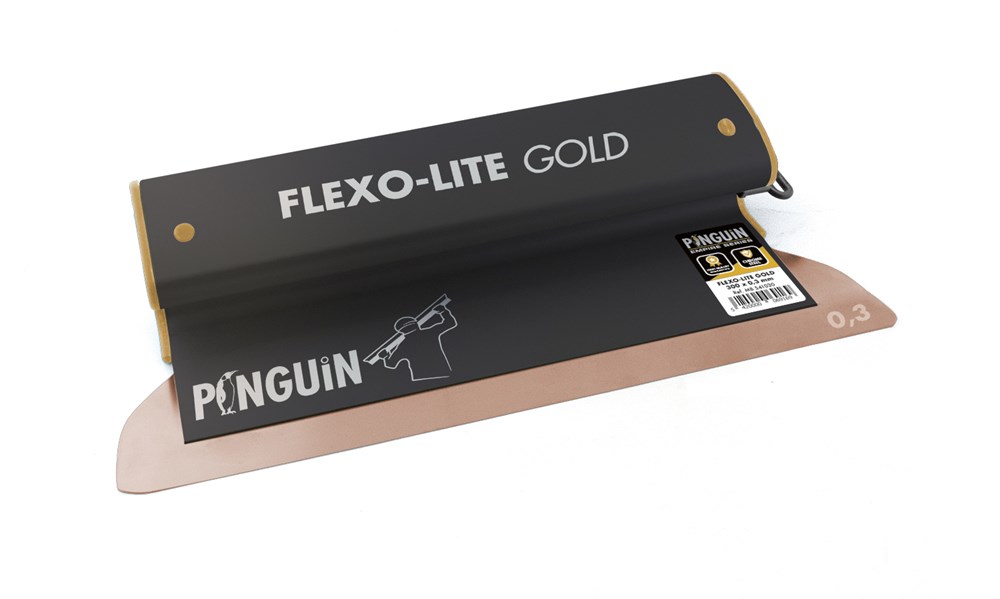 Contacteer onsPINGUIN "Flexo-lite GOLD" spackmes Bevestigbaar op adapter voor telescopische steel. Kenmerken: Blad dikte : 0,3 mm Met afgeronde hoeken Vervangbaar blad Roestvrijstaal blad