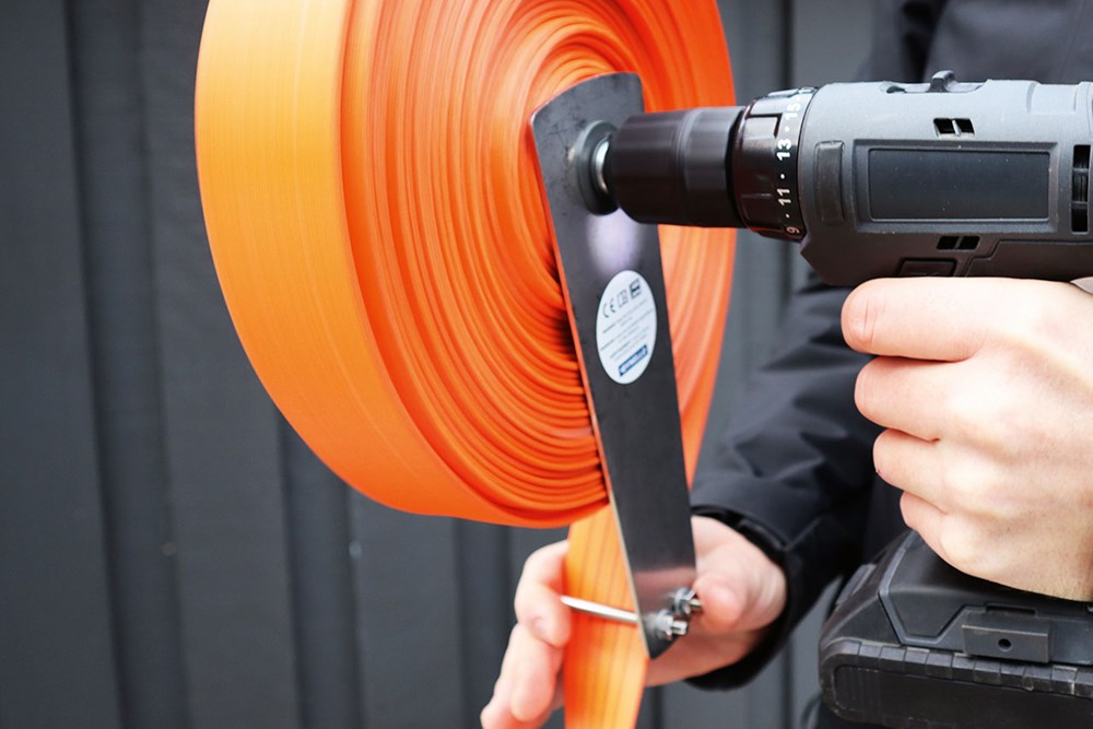 Contacteer onsSpanband oproller voor een accuboormachine, ontworpen voor spanbanden van 5 ton. Verbeterde XL-versie voor het oprollen van 30 meter spanband. • Roestvrij staal en aluminium • Past op boorkop Ø10mm • Geschikt voor 35 – 50 mm bandbreedte, max. lengte 30 m