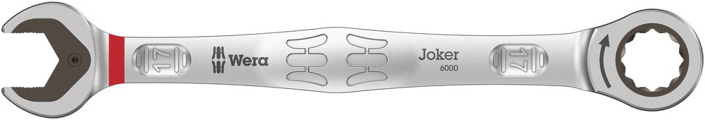Hoogwaardige, metrische ringratel-steeksleutel van Wera: Alles wat een sleutel moet kunnen. En nog veel meer. Sneller, beter, mooier. Kortom: een echte Joker. De nieuwe generatie steek-ringratel-sleutels. Voor zeskant-schroeven resp. moeren. Met vasthoudfunctie via metalen plaat in bek, om het verliezen van schroeven en moeren te reduceren. De verwisselbare metalen plaat in de bek houdt met extra harde tanden schroeven en moeren en verkleint het risico op wegglijden. De geïntegreerde eindaanslag voorkomt het wegglijden naar beneden van de schroefkop en maakt hoge draaimomenten mogelijk. De intelligente dubbele zeskant-geometrie zorgt voor een sluitende verbinding met schroef of moer en reduceert zo het risico op wegglijden. Dankzij de terughaalhoek van slechts 30° behoort het tijdrovende omkeren van de sleutel tijdens het schroeven tot het verleden. Ratelmechanisme aan ringzijde met uiterst fijne vertanding (80 tanden) voor flexibiliteit, ook op plekken waar weinig plaats is. De speciale smeedvorm maakt overdracht hoge draaimomenten mogelijk en geeft het geheel een hoge buigstijfheid. Gemaakt van sterk chroom-molybdeen staal met nikkel-chroom coating voor een hoge bescherming tegen corrosie. Met 'Take it easy'-Toolfinder: Kleurcodering op grootte.