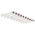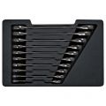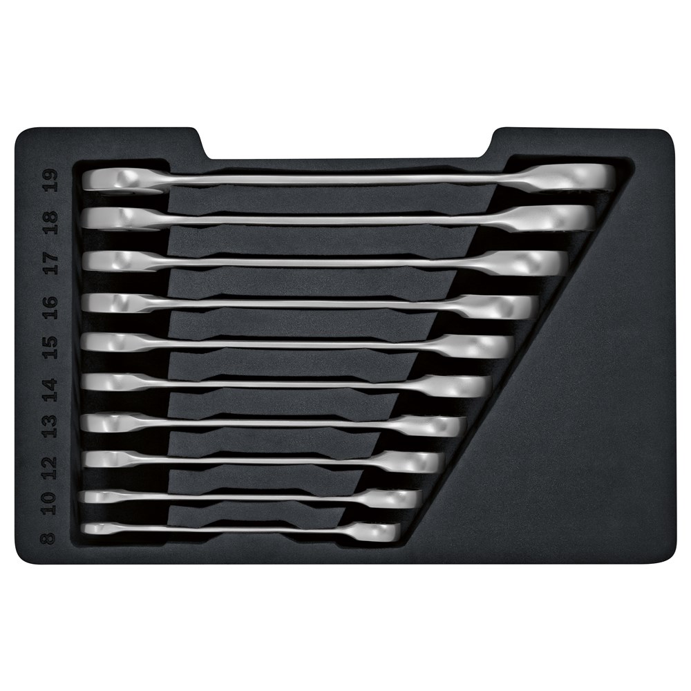 De veelzijdige 10-delige set bevat ratelsleutels in de meest voorkomende maten. Alle ratelsleutels kunnen worden gebruikt voor een groot aantal toepassingen, aangezien elke moersleutel een steek- en ratelringsleutel in één product combineert. Alle moersleutels zijn bij uitstek geschikt voor werken op krappe plekken, want voor de traploze ratel is slechts een terugdraaihoek van 3 graden nodig. Gemaakt van hoogwaardig chroom-vanadium-staal met een geharde tweezijdige zeskantring, zijn de moersleutels robuust en duurzaam. De 10-delige set bevat ratelsleutels in de volgende veelvoorkomende maten: 8, 10, 12, 13, 14, 15, 16, 17, 18, en 19 mm. De set wordt geleverd in een praktische halve inlay die compatibel is met het L-BOXX Mobility System van Bosch.