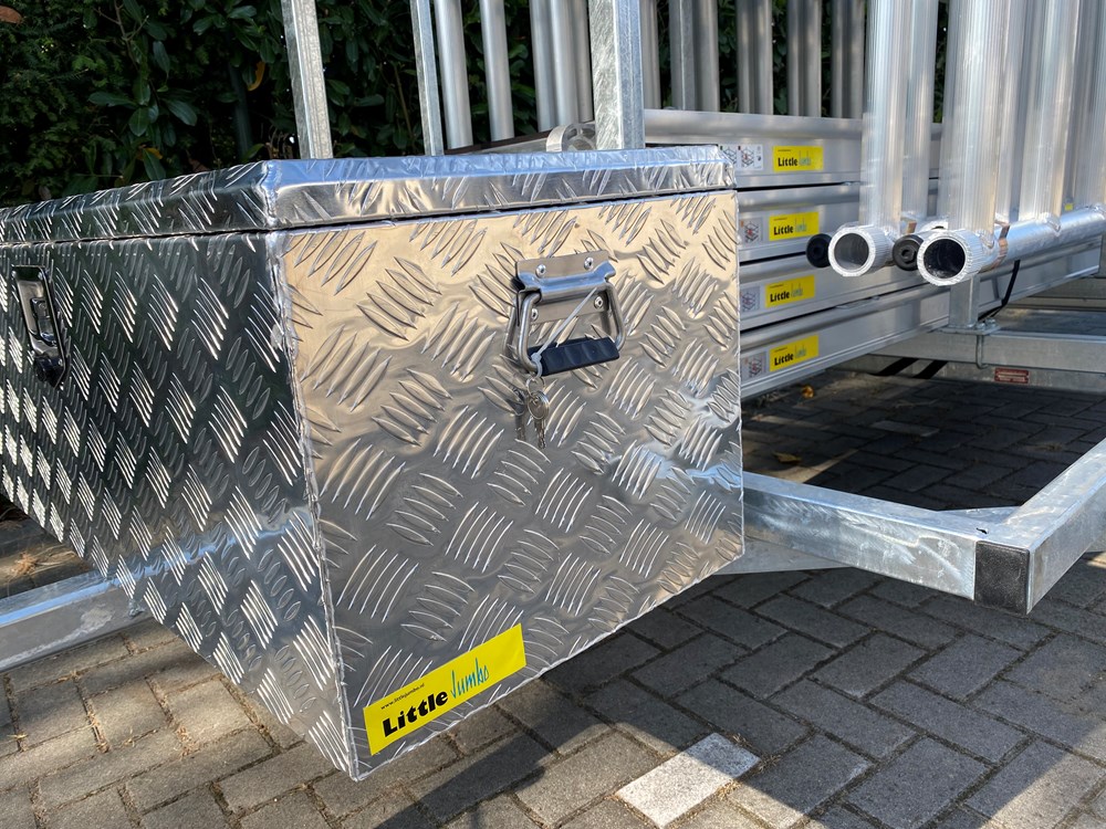 Contacteer onsRobuuste, afsluitbare aanhangwagen (3 gelijksluitende hangsloten bijgeleverd) • Grote, afsluitbare aluminium disseltoolbox 106x45x40 cm met gasveren voor steigerwielen en materieel • Ruimte voor uw bedrijfslogo’s • Afmetingen: 438 x 204 x 222 cm • Geschikt voor rijbewijs B (totaal max 750 kg) • Eigen gewicht ca 350 kg, belastbaar met max 400 kg • Ruimte tot 12 m steiger (afhankelijk model) • Met 13-polige stekker