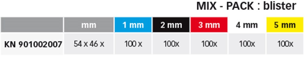 inhoud: 100 x 1 mm, 100 x 2 mm, 100 x 3 mm, 100 x 4 mm, 100 x 5 mm
