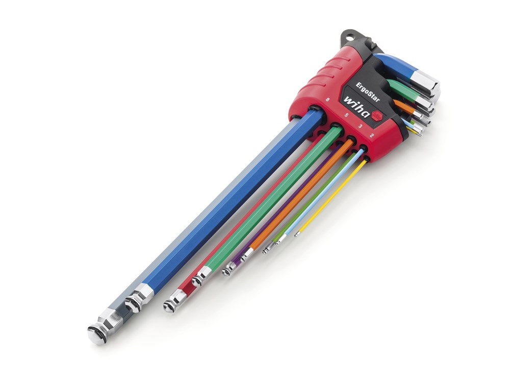 Wie kent dat niet? Bij veel stiftsleutelhouders kost het de nodige moeite om individuele sleutels uit te nemen of weer in de houder terug te steken. Daar maakt de Wiha ErgoStar nu een einde aan, want die lost dit probleem geniaal op. Wanneer één stiftsleutel in de houder wordt gedraaid, draaien alle andere sleutels onder dezelfde hoek opzij waardoor snel en comfortabel uitnemen mogelijk wordt. Een klemvoorziening zorgt ervoor, dat de sleutels zowel bij gesloten als geopende houder er niet uit kunnen vallen. Daarnaast kunnen de gekleurde stiftsleutels snel en eenvoudig terug worden gevonden en, dankzij de "glow in the dark"-lak, ook in het donker met UV-licht. Dat zorgt voor minder verloren tijd door het zoeken naar ontbrekende stiftsleutels en bij onderhoud aan installaties wordt het risico verkleind dat er onbedoeld gereedschap in de machine achterblijft. Dankzij de MagicRing-vasthoudfunctie met veerring houden de stiftsleutels alle standaard zeskantschroeven in elke stand perfect vast zonder magneet. Met de zeskantkogelkop kan moeiteloos worden geschroefd onder hoeken tot 25°. De stiftsleutelset bevat negen zeskantstiftsleutels in de gangbare maten.