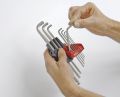 Bij werkzaamheden op krappe locaties is de schroef met gangbare stiftsleutels vaak niet te bereiken. Met de stiftsleutelset in ProStar houder behoort dit probleem tot het verleden. Door de geringere lengte van de korte stiftsleutelzijde worden krappe locaties beter toegankelijk. Dankzij de 95°-buiging van de stiftsleutels is er meer dan 30% extra ruimte voor de hand, wat leidt tot minder risico op letsel aan knokkels en vingertoppen. De zeskantkogelkop aan de lange zijde vergemakkelijkt de toegang tot schroeven en er kan moeiteloos mee worden geschroefd onder hoeken tot 25°. Stiftsleutels kunnen eenvoudig uit de houder worden genomen: met slechts één hand kan de ProStar houder worden geopend en kan elke willekeurige stiftsleutel, zonder de andere te moeten verdraaien, eenvoudig en snel worden uitgenomen. De set bevat negen mat verchroomde zeskant-kogelkopstiftsleutels in de gangbare maten. Met behulp van de ophanglus aan de houder kan de stiftsleutelset direct op de werkplek worden opgehangen.