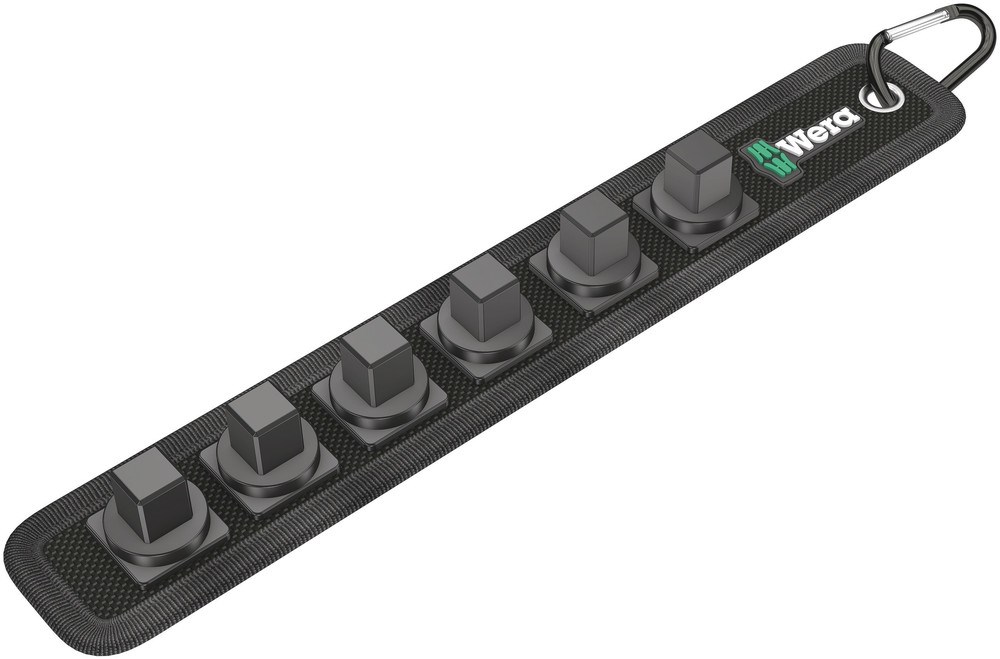 Robuuste stoffen riem (belt) in kenmerkend Wera design voor 6 doppen/bitdoppen (1/2") op beperkte ruimte. Een soepel draaimechanisme zorgt voor een veilige grip en maakt eenvoudig verwijderen van de doppen mogelijk. Inclusief karabijnhaak voor bevestiging aan riemlussen of tassen. Voorzien van vliesrug en klittenband voor eenvoudige bevestiging, bijvoorbeeld tegen een rek of aan een werkplaatswagen, maar ook aan het Wera 2go gereedschapstransportsysteem.