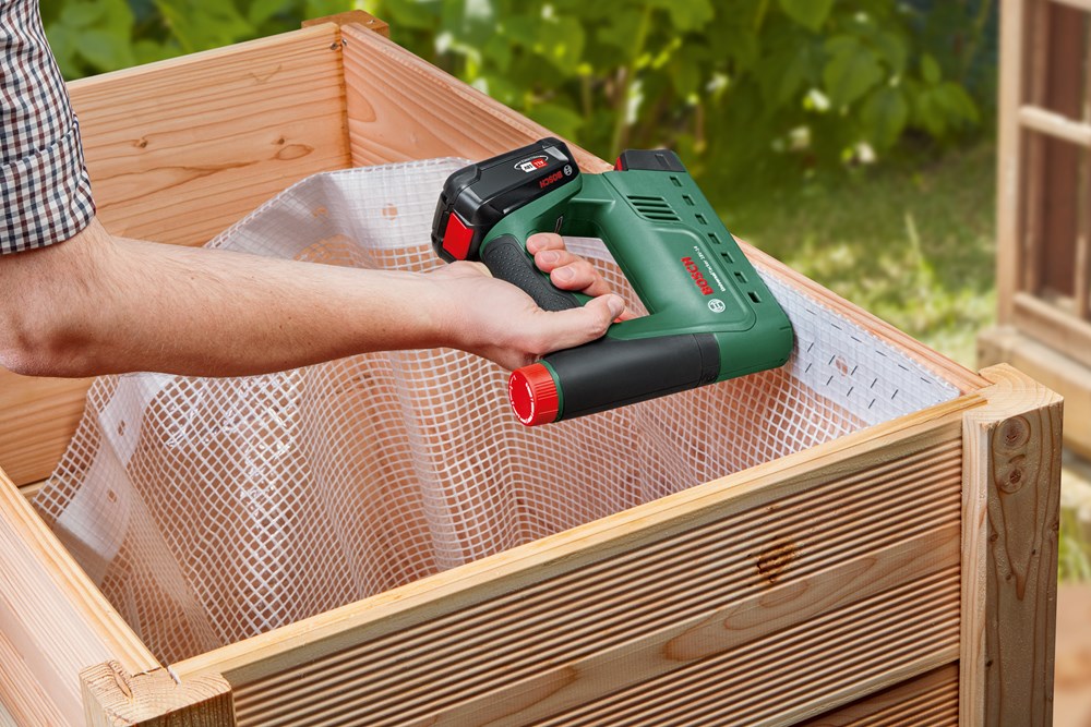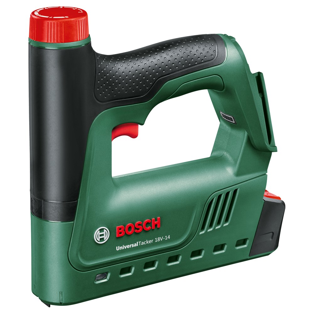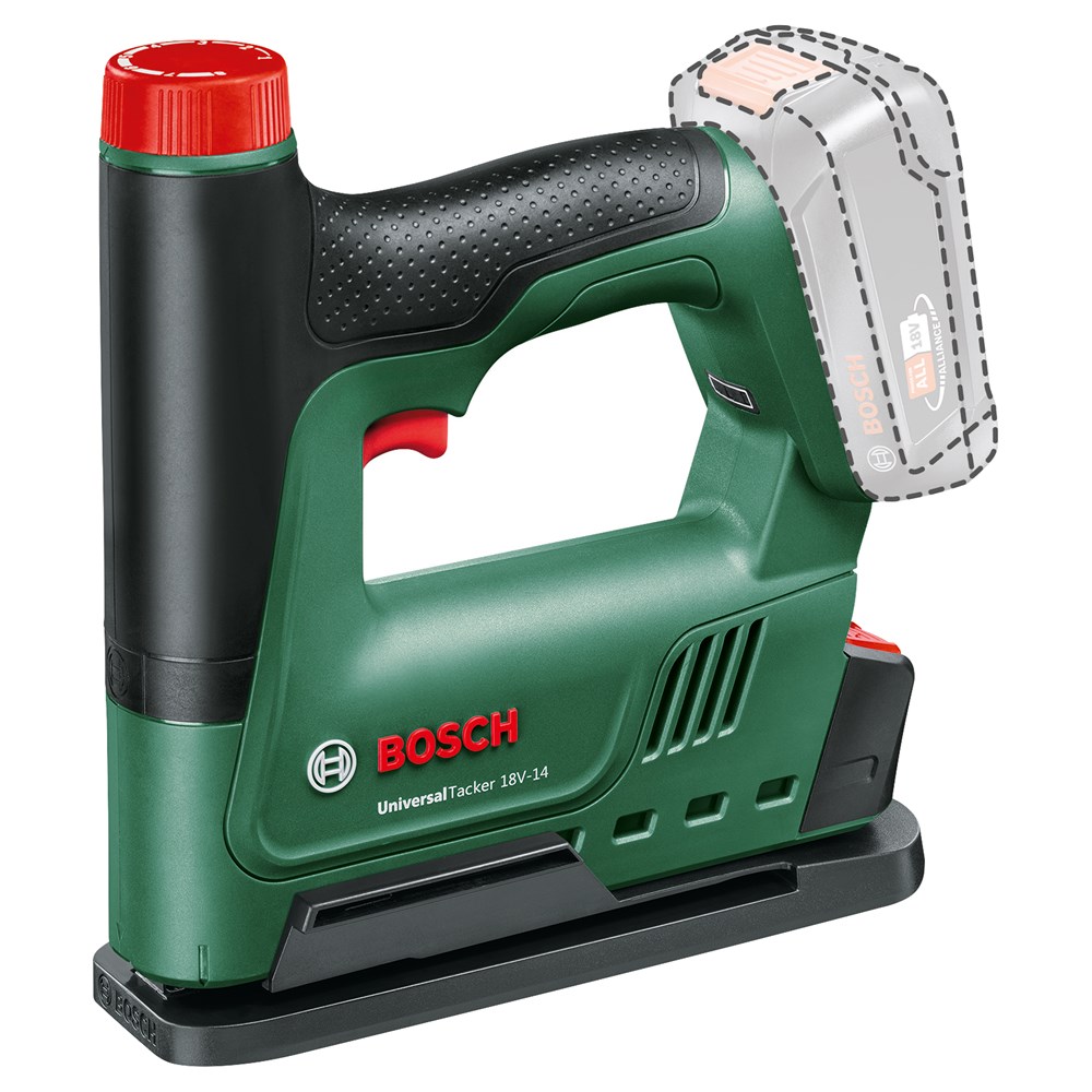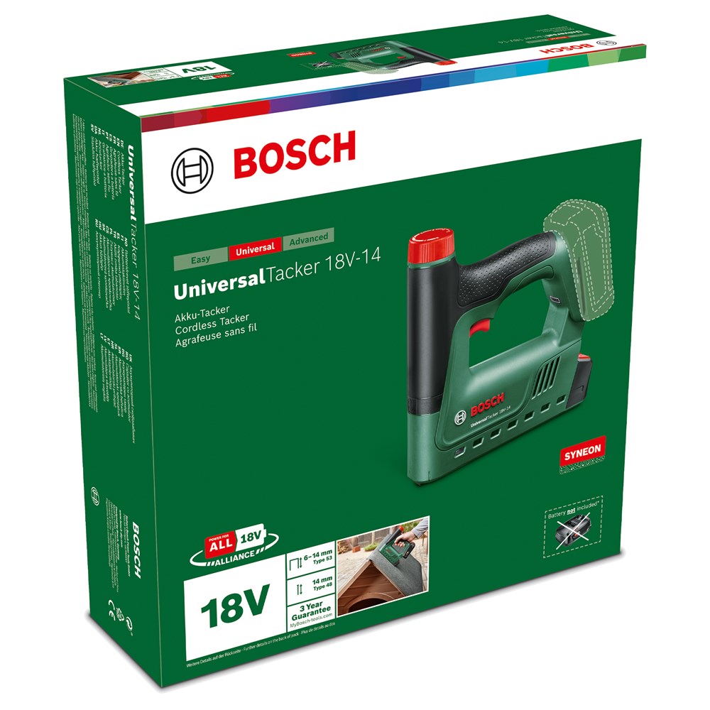 Ergonomisch comfort, kracht en flexibiliteit voor allerlei niet- en spijkerklussen De UniversalTacker 18V-14 is een accutacker die zorgt voor een nieuwe mate van comfort en veelzijdigheid bij bevestigingsklussen tijdens het doe-het-zelven. Ontworpen voor gemakkelijk nieten en spijkeren drijft deze ergonomische tacker nieten en spijkers krachtig in zacht en hard hout. Bij het werken met verschillende materialen en nietlengtes kan de slag naar de optimale sterkte worden aangepast door aan de stelknop voor slagkracht te draaien. Het Push + Release systeem garandeert optimale controle tijdens gebruik door zelfactivatie uit te sluiten. Voor snelle bevestigingsklussen zoals het bekleden van verhoogde tuinperken kan de contactactiveringsfunctie worden ingeschakeld voor max. 30 schoten per minuut. En met de praktische bijvulaanduiding kan in een oogopslag het niveau van de nieten worden gecontroleerd en de tacker indien nodig worden bijgevuld. De geïntegreerde Bosch Syneon Technology zorgt voor optimaal vermogen en maximale looptijd. Het gereedschap maakt deel uit van het 18V POWER FOR ALL-systeem. Eén accu kan worden gebruikt voor alle 18V POWER FOR ALL-gereedschappen.