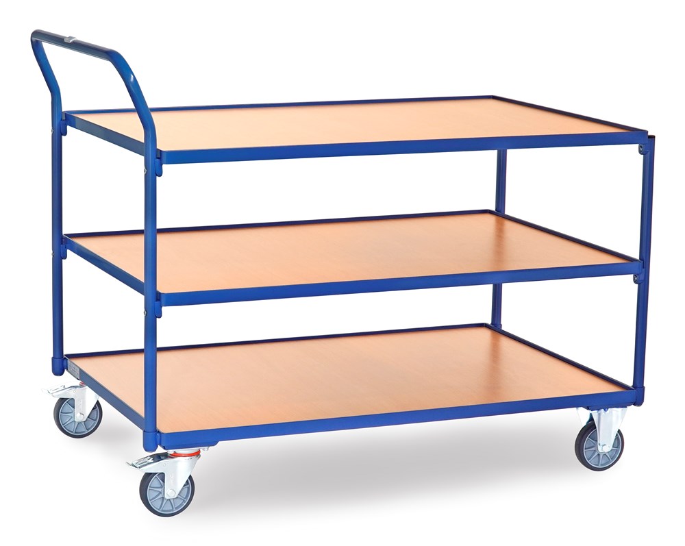 Contacteer onsStalen buis en gelast profielstaal, gepoedercoat. Schroefconstructie. 3 Etages van houten plaat, toplaag beukendecor, liggend in stalen frame, rand 12 mm hoog. Duwbeugel omhoogstaand. 2 Zwenk- en 2 bokwielen, TPE rubber, naaf met kogellager. Zwenkwielen met rem, conform EU-norm EN 1757-3 (veiligheidsnorm voor platformwagens). Draagvermogen bovenste en middelste laadvlak 80 kg.
