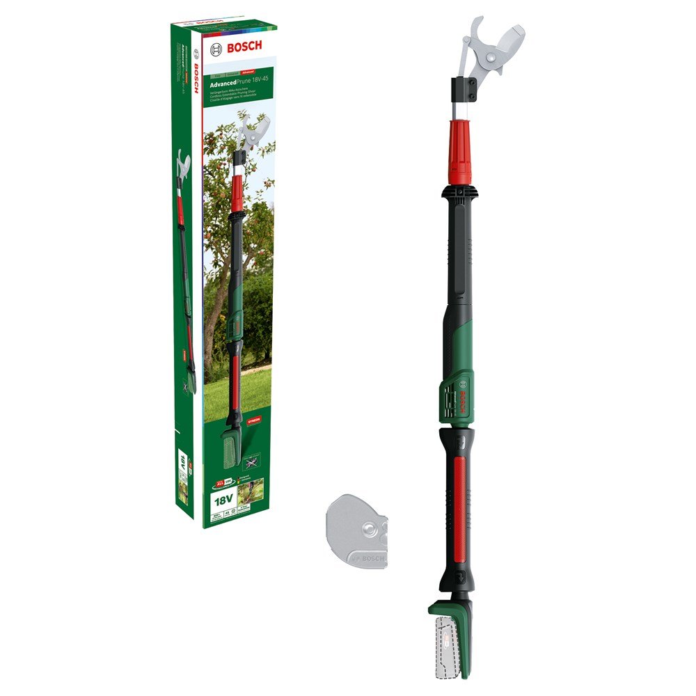 De AdvancedPrune 18V-45 is een snoeischaar met hoog prestatievermogen die de fysieke inspanning van snoeien vermindert. Door de unieke 360° schakelaar in combinatie met een slank ontwerp kan er op krappe plekken worden gesnoeid, ongeacht de werkhoek. Dankzij de duurzame roestvrijstalen messen kan zacht hout van 45 mm probleemloos worden gesnoeid, zodat een gezonde groei wordt gewaarborgd. Om moeilijk bereikbare takken te kunnen bereiken, kan de lengte van het gereedschap worden vergroot van 1,2 m naar 1,8 mm door er een verlengsteel aan te bevestigen. Met de haak op het mes kunnen dikke en verstrikte takken eenvoudig worden bereikt en verwijderd. Volledig opgeladen heeft dit gereedschap bij het snoeien van takken van 30 mm dankzij de Quick Cut-technologie een snoeicapaciteit van ongeveer 600 snoeibewegingen met een snelheid van minder dan 1,2 seconden per tak. Een accuniveau-aanduiding op de handgreep zorgt ervoor dat de status van het vermogen, zelfs tijdens het werk, goed in het oog kan worden gehouden. Geïntegreerde Bosch Syneon Technology zorgt voor optimaal vermogen en maximale looptijd. Het gereedschap maakt deel uit van het 18V POWER FOR ALL-systeem. Eén accu kan worden gebruikt voor alle 18V POWER FOR ALL-gereedschappen.