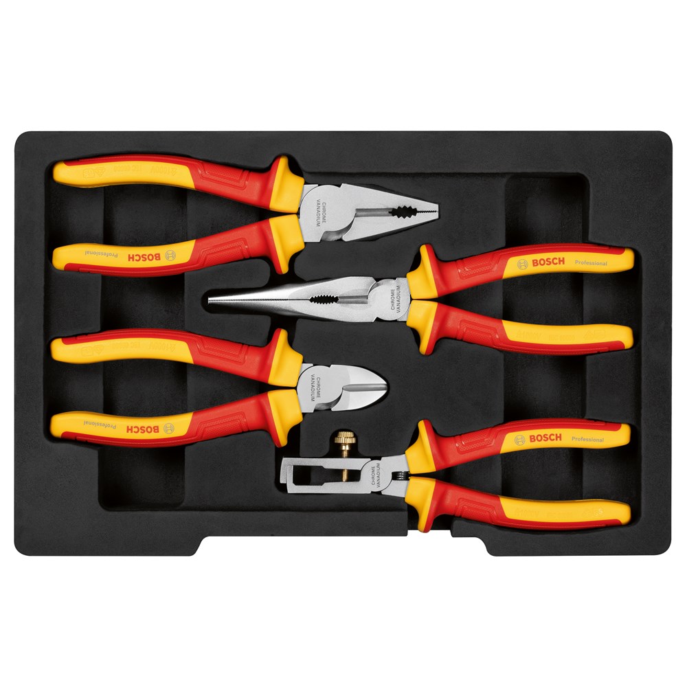 De 4-delige set bevat VDE combinatietang (180 mm), een VDE diagonale zijkniptang (160 mm), VDE punttang (200 mm) en een VDE draadstriptang (160 mm). Alle tangen hebben een ergonomische softgrip. Deze set wordt geleverd in een 1/2 L-BOXX-inlay die perfect compatibel is met ons Bosch Mobility System.