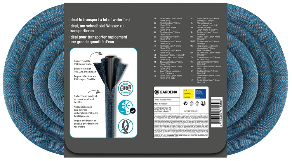 Contacteer onsDe Textielslang Liano™ Xtreme 19 mm (3/4"), 20 m van GARDENA is ideaal voor langdurige, moeilijke en veeleisende bewatering van middelgrote tuinen. De diameter van 19 mm (3/4") maakt een sterke waterstroom mogelijk en is het meest geschikt om snel veel water mee te verplaatsen. De Liano™ Xtreme is bijvoorbeeld ideaal om grote sprinklersystemen of pompen van water te voorzien. Dankzij de voorgemonteerde Original GARDENA System-accessoires Liano™ Slangstuk en Liano™ Waterstop kan de slang snel ingezet worden. De stevige slang kan bijzonder extreme situaties aan en knikt niet tijdens het werk. De vuilafstotende slang gaat gemakkelijk om met ruig terrein zoals rozendoorns, keien of ruwe muren. Deze duurzaamheid komt doordat de buitenslang gemaakt is van een extreem bestendig textiel. Hij maakt indruk met zijn buitengewone prestaties, dankzij de zeer flexibele PVC-binnenslang, die het bijzonder makkelijk om te manoeuvreren met de slang in je hand. Het lage gewicht draagt bij aan het comfort, want de Liano™ Xtreme is tot wel 50% lichter dan gebruikelijke PVC-slangen. Daarnaast is zijn aangename oppervlak comfortabel in gebruik. De uitstekende flexibiliteit betekent dat ruimtebesparend opbergen van de slang makkelijk is, omdat hij zich aanpast aan de beschikbare opbergruimte. De barstdruk is 35 bar. Dankzij de uv- en vorstbestendigheid kan de waterslang het hele jaar door buiten blijven. De Liano™ Xtreme is vrij van schadelijke stoffen zoals ftalaten (0,1%), maar ook cadmium, lood en barium (0,1%). De duurzame Textielslang Liano™ Xtreme is een in Europa gemaakt kwaliteitsproduct, die wordt gedekt door een lange fabrieksgarantie van 30 jaar door GARDENA, na een online registratie.