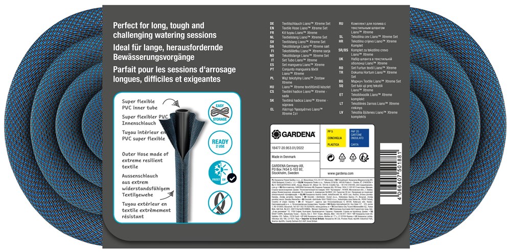 Contacteer onsDe Textielslang Liano™ Xtreme 30 m Set van GARDENA is optimaal voor het bewateren van een grote tuin. De 30 m lange textielslang met een diameter van 13 mm (1/2") is ideaal geschikt voor langdurige en veeleisende bewatering. Naast de Liano™ Xtreme bevat de gebruiksklare, volledige set de voorgemonteerde Original GARDENA System-onderdelen: de Liano™ Waterstop, maar ook een Liano™ Slangstuk, twee Kraanstukken en een Reinigingspistool. Hij kan worden aangesloten op drie verschillende kraangroottes, doordat er een reduceerstuk is geïntegreerd in een van de twee kraanstukken. De combinatie van een zeer flexibele PVC-binnenslang en de innovatieve buitenslang gemaakt van extreem bestendig textiel zorgt voor uitstekende prestaties, flexibiliteit en duurzaamheid. Tijdens het verplaatsen laat de vuilafstotende tuinslang zijn krachten zien. Hij gaat gemakkelijk om met keien, rozendoorns, ruig terrein of slepen langs ruwe muren. De stevige Liano™ Xtreme knikt niet en kan daarom makkelijk om obstakels worden geleid. Dankzij de goed ontworpen haptische eigenschappen en het laag gewicht, ligt hij erg comfortabel in de hand. De textielslang is tot wel 50% lichter dan conventionele PVC-slangen. Dit is erg handig, zeker bij langdurige bewatering. Dankzij zijn flexibiliteit is het makkelijk om de Liano™ Xtreme ruimtebesparend op te bergen. Hij is makkelijk aan te passen aan de beschikbare opbergruimte en neemt daardoor minder ruimte in op de plank of in de garage. De slang heeft een barstdruk van 35 bar en uv- en vorstbestendigheid voor gebruik het hele jaar door. De Textielslang Liano™ Xtreme is vrij van schadelijke stoffen zoals ftalaten (0,1%), maar ook cadmium, lood en barium (0,1%). Na een online registratie geeft GARDENA een garantie van 30 jaar voor dit kwaliteitsproduct, dat gemaakt is in Europa.