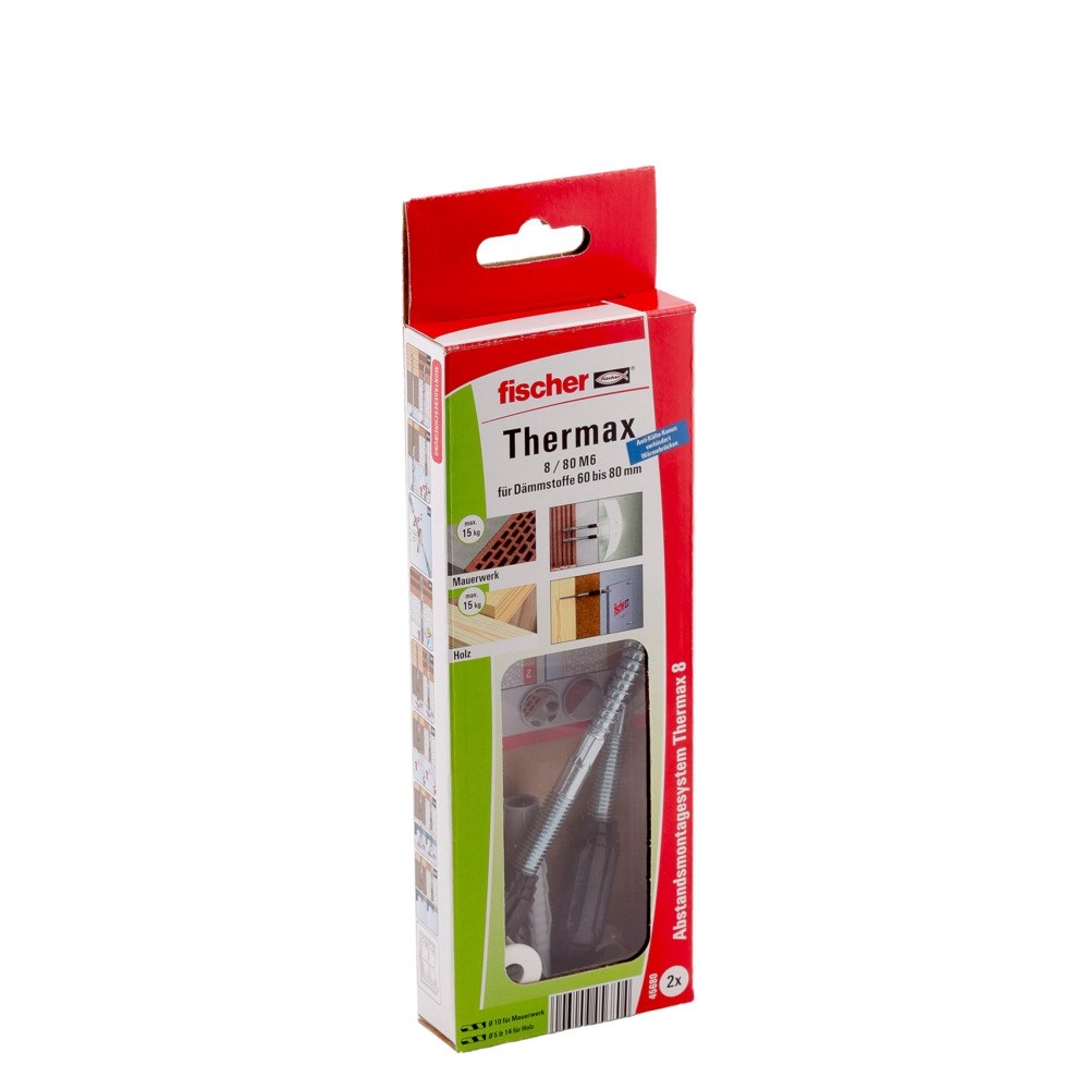 Contacteer onsHet fischer Afstandsmontagesysteem TherMax 8 is een oplossing voor een bevestiging in de buitenmuur of warmtebrug in de WDVS. De stokschroef met de glasvezelversterkte conus freest zich automatisch door de pleister in het isolatiemateriaal. De stokschroef wordt bij de montage in de Universeelplug UX gedraaid en verankert zo stevig in het bouwmateriaal. De anti-koude-conus op de kop van de stokschroef onderbreekt de warmtebrug en neemt de buitenste bevestiging op. De TherMax bevestigt lichte lasten zoals lampen, brievenbussen of bliksemafleiders in beton, cellenbeton en metselwerk van volle en geperforeerde baksteen.