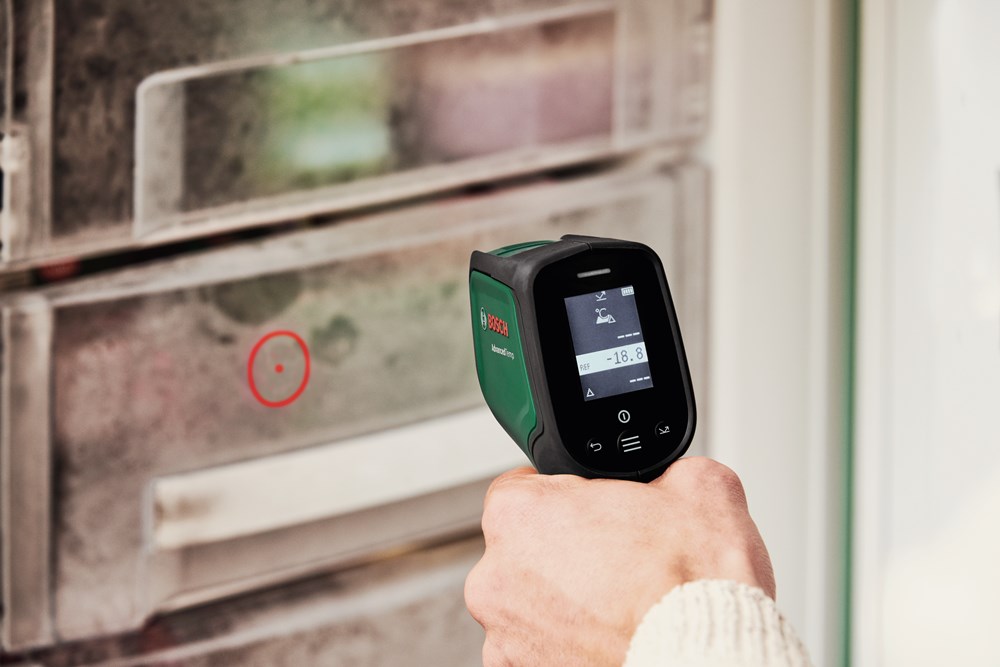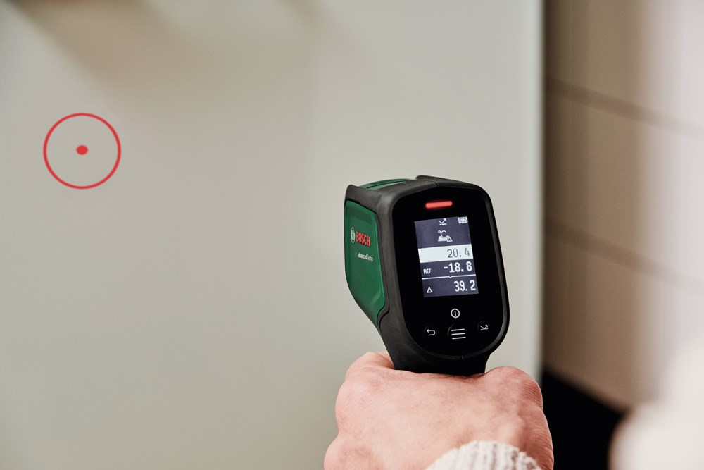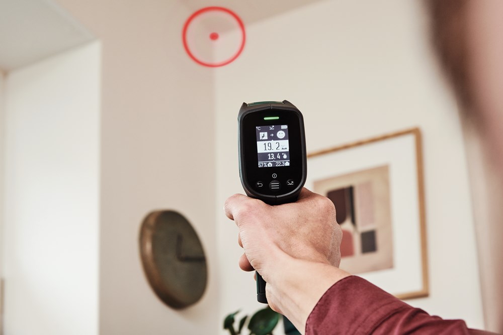 Eenvoudig meetgereedschap voor het opsporen van tocht, vermijden van schimmelvorming en een betere energie-efficiëntie De AdvancedTemp is het nauwkeurige en gebruiksvriendelijke gereedschap voor een betere woonkwaliteit en energie-efficiëntie thuis. Deze maakt gebruik van infrarood puntmeting in combinatie met analyse van de omgevingstemperatuur om onvolkomenheden in binnenklimaat en isolatie op te sporen. Met een intuïtieve bediening heeft het compacte gereedschap vier modi voor een uitstekend overzicht van oppervlakte- en referentietemperaturen, risico van schimmelvorming en energieverlies. In de modus voor oppervlaktetemperatuur heeft de AdvancedTemp een afleesbereik van -30°C tot +500°C. Resultaten kunnen eenvoudig worden geïnterpreteerd op het scherm van het gereedschap met behulp vaan verkeerslicht-LED.