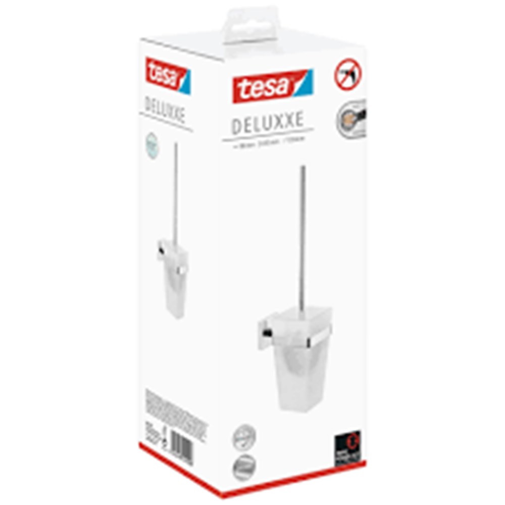 Contacteer onsHet ontwerp maakt de tesa® Deluxxe toiletborstelset een accessoire dat elke omgeving mooier maakt. De matglazen beker is niet alleen mooi, maar kan ook eenvoudig worden verwijderd voor reiniging. De zwarte borstelkop kan worden vervangen. Omdat hij wordt bevestigd met een zelfklevende oplossing in plaats van te boren, kan geen enkel oppervlak schade oplopen. Er worden alleen hoogwaardige materialen gebruikt voor de houder, wat een langdurig gebruik garandeert. Het accessoire kan snel en zonder sporen worden verwijderd. De toiletborstel kan ook elders worden geplaatst met adapter BK20. tesa.Power.Kit Glue: Let op! Bij gebruik kunnen gevaarlijke inhaleerbare stofdeeltjes worden gevormd. Stof niet inademen.