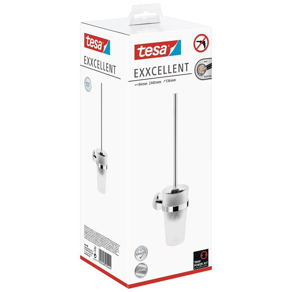 Contacteer onsHet ontwerp van de chique tesa® Exxcellent toiletborstelset is mooi om te zien. Het matglas van de kegelvormige beker vormt een mooie combinatie met het verchroomde metaal van het handvat en de drager. De beker kan worden verwijderd voor reiniging en de zwarte borstelkop kan worden losgeschroefd, zodat deze gewassen of vervangen kan worden. De toiletborstelset wordt gemonteerd met een zelfklevende oplossing. Zonder te boren, zodat er geen schade aan muren of tegels wordt aangebracht. Hij kan gemakkelijk worden verwijderd zonder lijmresten en elders opnieuw gebruikt worden met adapter BK20. tesa.Power.Kit Glue: Let op! Bij gebruik kunnen gevaarlijke inhaleerbare stofdeeltjes worden gevormd. Stof niet inademen.