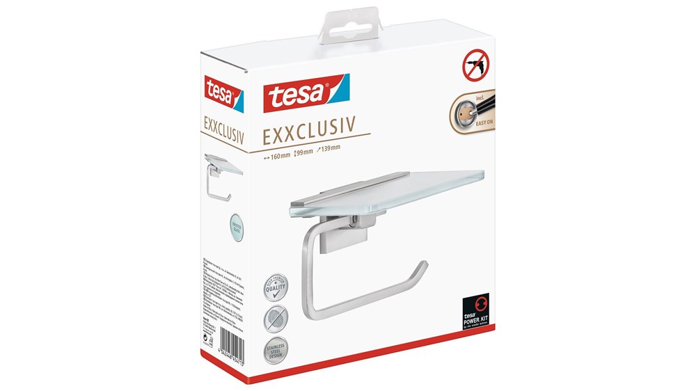 Contacteer onsDe tesa® Exxclusiv toiletrolhouder met plank is een opvallend element in elke badkamer en heeft niet alleen een verfijnd rechthoekig ontwerp, maar ook een glazen plank om voorwerpen zoals een smartphone even neer te leggen. Gemaakt van duurzame, hoogwaardige materialen, waterproof en anti-vingerafdruk, deze houder gaat lang mee. Hij wordt bevestigd met een zelfklevende oplossing die 12 uur moet uitharden. Boren is niet nodig, zodat muren intact blijven. Hij kan worden verwijderd elders worden hergebruikt met adapter BK20. tesa.Power.Kit Glue: Let op! Bij gebruik kunnen gevaarlijke inhaleerbare stofdeeltjes worden gevormd. Stof niet inademen.