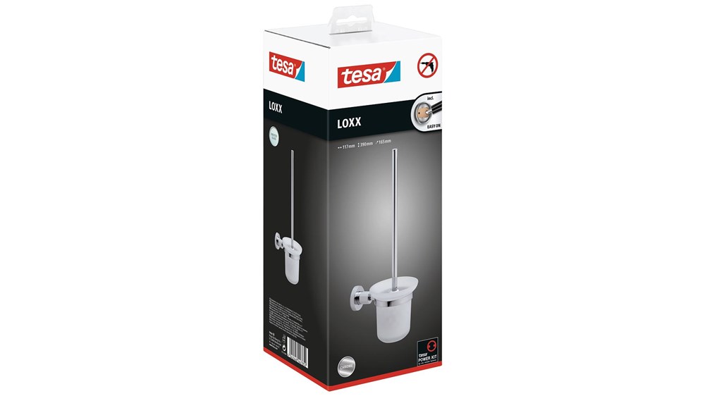 Contacteer onsDe ronde tesa® Loxx toiletborstelhouder is een combinatie van verchroomd metaal en gesatineerd glas. Samen vormen ze een stijlvol, speels ontwerp, dat de inrichting van je badkamer zeker zal verbeteren. Geen schade aan muren of tegels, omdat de houder wordt bevestigd met een zelfklevende oplossing die 12 uur nodig heeft om te drogen. Boren is niet nodig. Het is een snelle klus om de houder te verwijderen zonder lijmresten, en de houder kan elders opnieuw gebruikt worden met adapter BK20. De glazen beker kan worden verwijderd voor eenvoudige reiniging, de borstelkop kan worden losgeschroefd. tesa.Power.Kit Glue: Let op! Bij gebruik kunnen gevaarlijke inhaleerbare stofdeeltjes worden gevormd. Stof niet inademen.