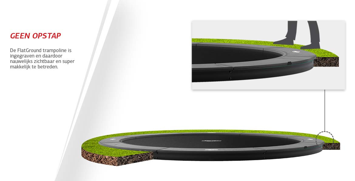 Contacteer onsTrampoline springen is zeker niet alleen voor kinderen. Het is namelijk voor jong en oud heel gezond om trampoline te springen. De BERG Elite FlatGround is perfect geïntegreerd in je tuin. Het stevige frame van deze trampoline wordt volledig ingegraven. Het enige wat je ziet zijn de beschermrand en het springdoek. Op deze trampoline spring je licht en fijn. De trampoline heeft namelijk TwinSpring veren, die zorgen voor lekkerder springen, en het AirFlow springdoek waardoor je hoger springt. Door de speciale dempende spanbanden kan de lucht goed ontsnappen en klappert de beschermrand niet tegen het springdoek.