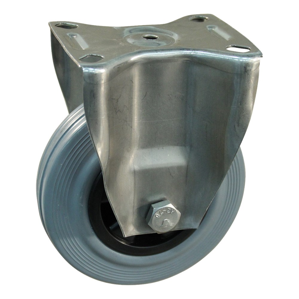 Transportwiel (bok) met plaatbevestiging met rvs gaffel, wiel met PP velg, standaard grijze rubberen band