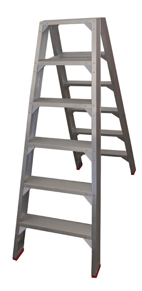 Contacteer onsOerdegelijke industrietrap met 4 schetsplaten en 12(!) popnagels in iedere trede. Het geanodiseerd aluminium is vuilafstotend en geeft niet af (geen vuile handen). De 10 cm diepe treden en het grote bordes zorgen voor een comfortabele werkplek. Bij de dubbel oploopbare trap is er een tweede stabordes dat als spreidbeveiliging fungeert. Vanaf 2x3 treden compleet geleverd inclusief verplichte steunbeugel (ARBO).