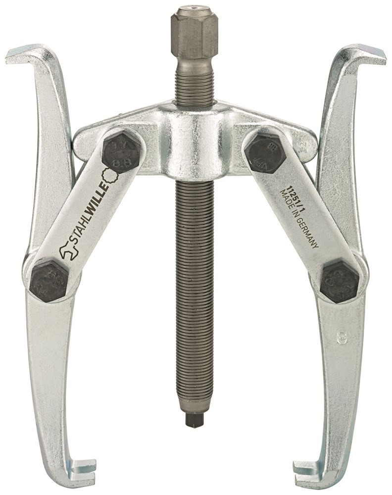 Contacteer onsTwee-armig, met omkeerbare, aan beide kanten te gebruiken trekhaken, verzinkt; voor het lostrekken van tandwielen, kogellagers, v-riempoelies, ventilateurwielen en soortgelijke delen van een as of aandrijfas; voor het lostrekken van kogellagers, kogellager-buitenringen en bussen; voor gebruik als binnentrekker moeten de haken worden gezwenkt en de spindel omgedraaid of de haken gedraaid.