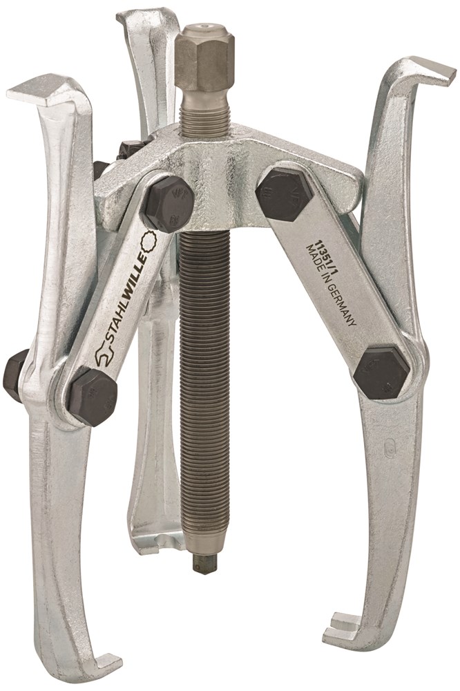 Contacteer onsDrie-armig, met omkeerbare, aan beide kanten te gebruiken trekhaken, verzinkt; voor het lostrekken van tandwielen, kogellagers, v-riempoelies, ventilateurwielen en soortgelijke delen van een as of aandrijfas; voor het lostrekken van kogellagers, kogellager-buitenringen en bussen; voor gebruik als binnentrekker moeten de haken worden gezwenkt en de spindel omgedraaid of de haken gedraaid.