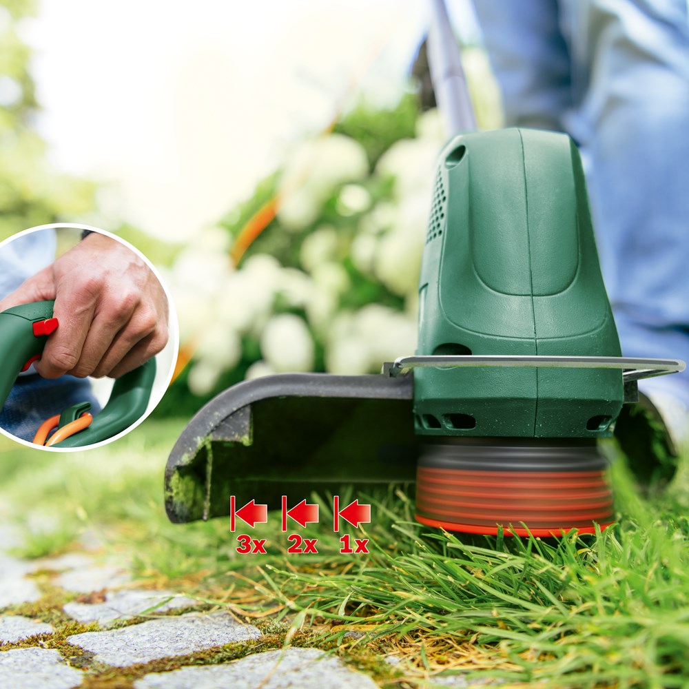 De ideale keus voor comfortabel trimmen en snelle resultaten De lichte EasyGrassCut 26 is ontworpen voor comfort en gemak. Deze beschikt over een uitgebalanceerd laag gewicht voor gemakkelijk hanteren en manoeuvreren, zodat de gebruiker vooral bij langdurig gebruik minder snel moe wordt. De semiautomatische spoel van de trimmer voert de trimdraad bij elke druk op de schakelaar toe, zodat de spoel niet handmatig hoeft te worden ingesteld of met de kop ergens tegenaan hoeft te worden getikt voor continu en zorgeloos trimmen zonder onderbrekingen. De hoogwaardige afwerking van het gereedschap in combinatie met een krachtige motor en een duurzame trimdraad zorgt voor ideale snijresultaten en een lange levensduur.