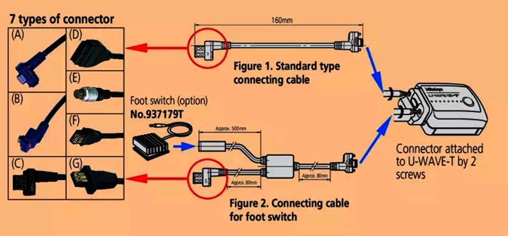 Een korte kabel wordt gebruikt om een meetinstrument aan te sluiten op de U-WAVE-T-eenheid. Selecteer hieronder de juiste kabel van A tot G (7 soorten) om het meetinstrument aan te sluiten. Een bevestigingsklemmetje voor dekabel wordt standaard meegeleverd.