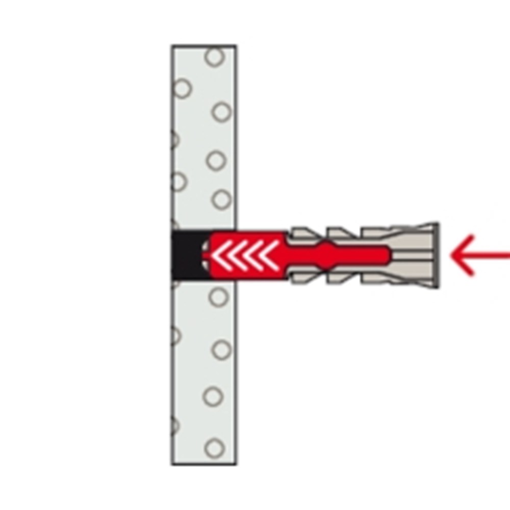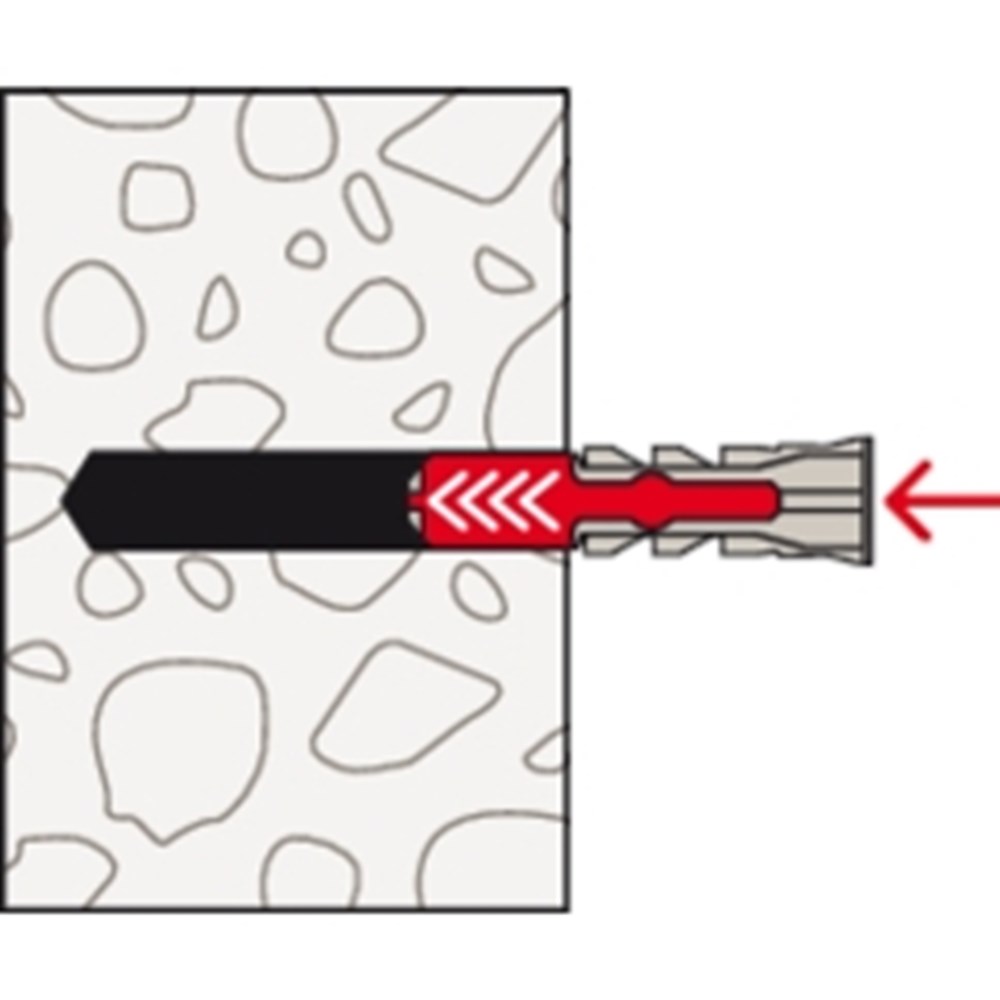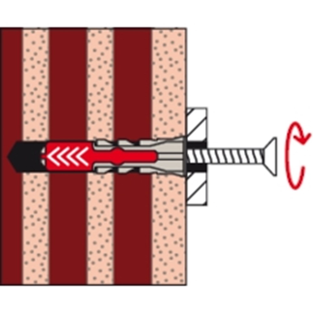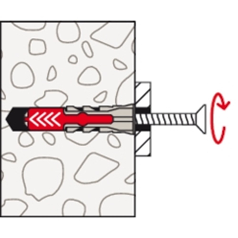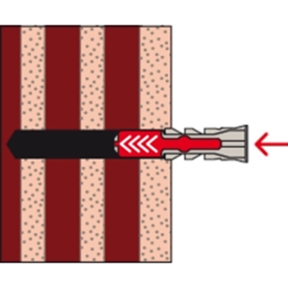 Contacteer onsDe fischer DuoPower heeft een zeer hoge bevestigingswaarde door de 2 componenten: De grijze component van kwalitatief hoogwaardig nylon activeert, afhankelijk van het bouwmateriaal, automatische het optimale werkingsprincipe (spreiden, tikken, knopen) voor het optimaal houvast. De expansievleugels van de rode component ondersteunen de betrouwbare spreiding en biedt extra veiligheid voor de grijze component. De schroef gewoon indraaien en tot slot goed „aantrekken“. De schroef niet de vast aandraaien. De bij de kop aangebrachte rand voorkomt, dat de plug in het boorgat glijdt. De meegeleverde schroeven zijn exact op de fischer spreidplug DuoPower afgestemd.