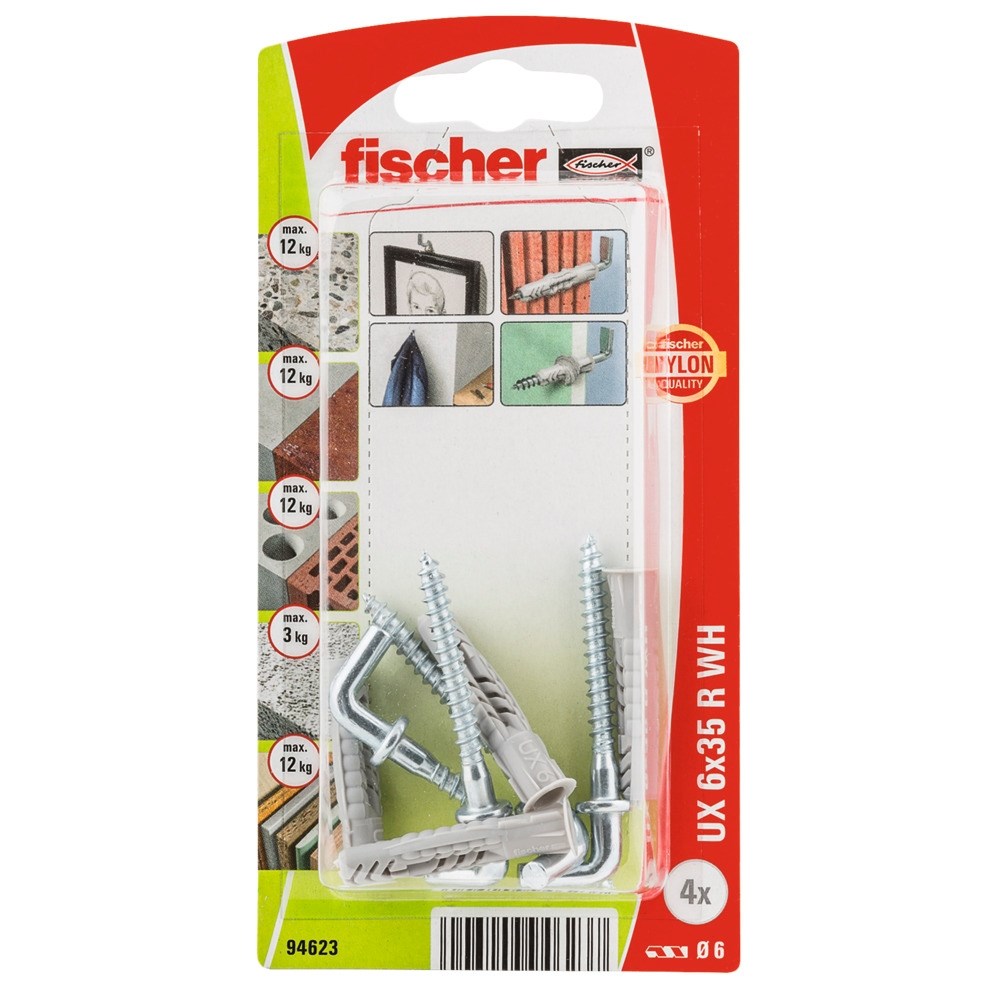 Contacteer onsDe fischer Universele plug UX is een allrounder van kwalitatief hoogwaardig nylon. De plug houdt in beton, maar ook in cellenbeton, metselwerk en gipskarton- of gipsvezelplaten. In deze materialen vormt de plug een knoop. Handig daarbij is de voorgevormde rand. Daardoor glijdt de plug bij het insteken niet in het boorgat. In de verpakking worden de haken al meegeleverd. Zo hoeft u nooit te zoeken en weet u zeker dat ze perfect bij de plug passen. Met de fischer Universeelplug UX met haak kunnen bijvoorbeeld schilderijen, planken en hangkasten worden bevestigd.