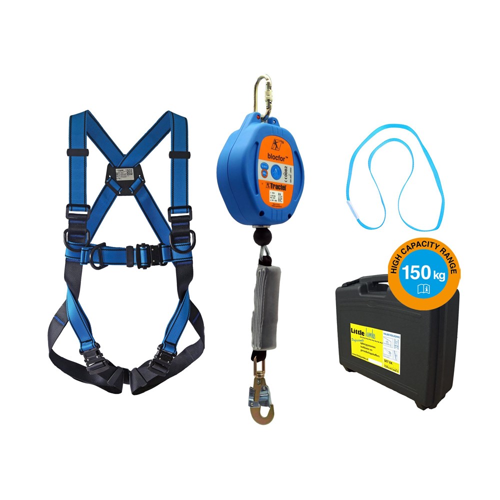 Contacteer onsUniversele set voor verticaal en horizontaal gebruik De set EK 45 bestaat uit: Instelbaar Harnas HT43 - EN 361 met bevestigingspunten op borst en rug Ankerstrop 100 cm Valblok Blocfor met AES, 10 m staalkabel en automatisch oprolsysteem. 1 musketonhaak - EN 362 Opbergkoffer