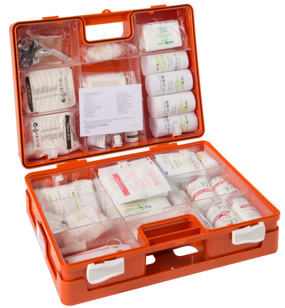 2 wondsnelverband 6x8 cm - 4 snelverband nr.1 K - 2 snelverband nr. 2 M - 1 snelverband nr. 3 L - 16 steriele gaasjes 1/16 - 10 steriele gaasjes 5x5 - 10 steriele gaasjes 10x10 - 2 metalline compressen 8x10 - 2 metalline compressen 10x12 - 6 verbandklemmetjes - 6 veiligheidsspelden - 1 splinterpincet - 1 knievormige verbandschaar (stompe punt) - 2 cambric zwachtel 4m x 8cm - 2 cambric zwachtel 4m x 10cm - 3 elast. hydrofiel windsel 4m x 6cm - 3 elast. hydrofiel windsel 4m x 8cm - 1 doos wondpleister - 1 set wegwerphandschoenen - 4 vette of synthetische watten - 1 kleefpleister 5m x 2,5 cm - 1 mondkapje voor beademing - 3 driekante doek-2 witte watten à 25 gram - 1 ass. gaaspleister met wondkussen - 1 betadine/desinfectant 30.