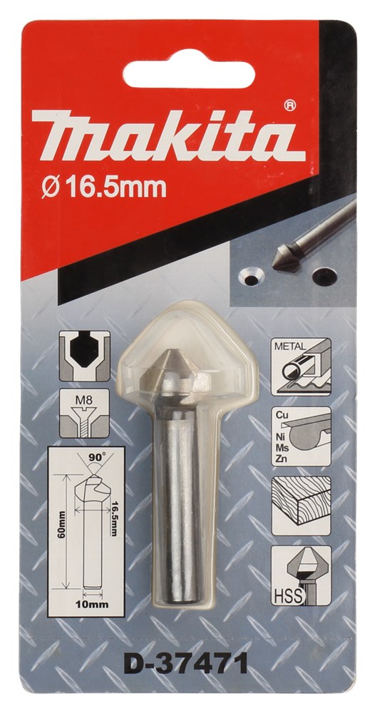 Makita verzinkboor 16,5mm voor het afschuinen van een boorgat, om zo de schroefkop te verzinken in het materiaal. Deze verzinkboor is voorzien van 3 snijvlakken met een verzinkhoek van 90 graden.