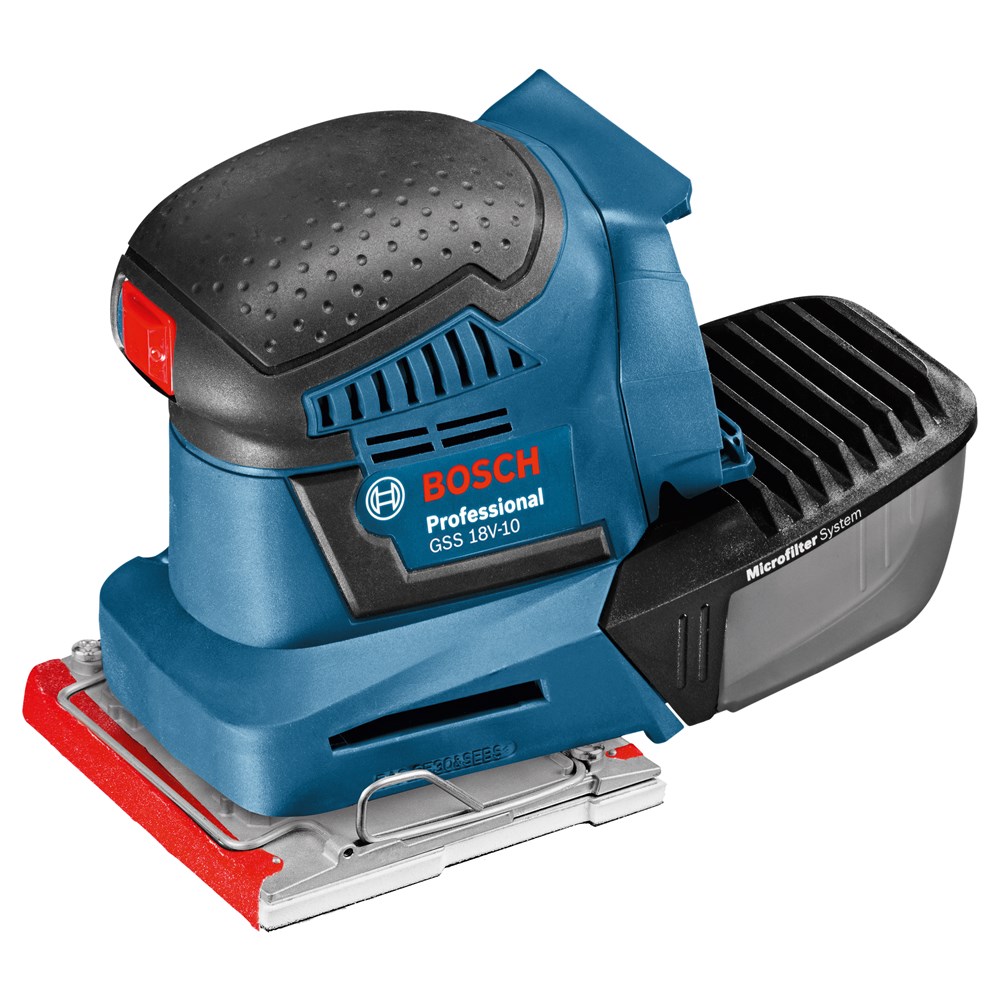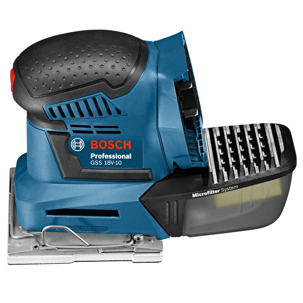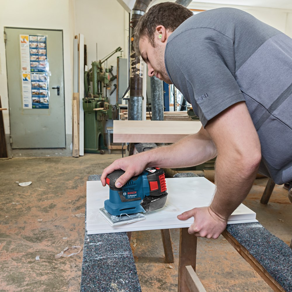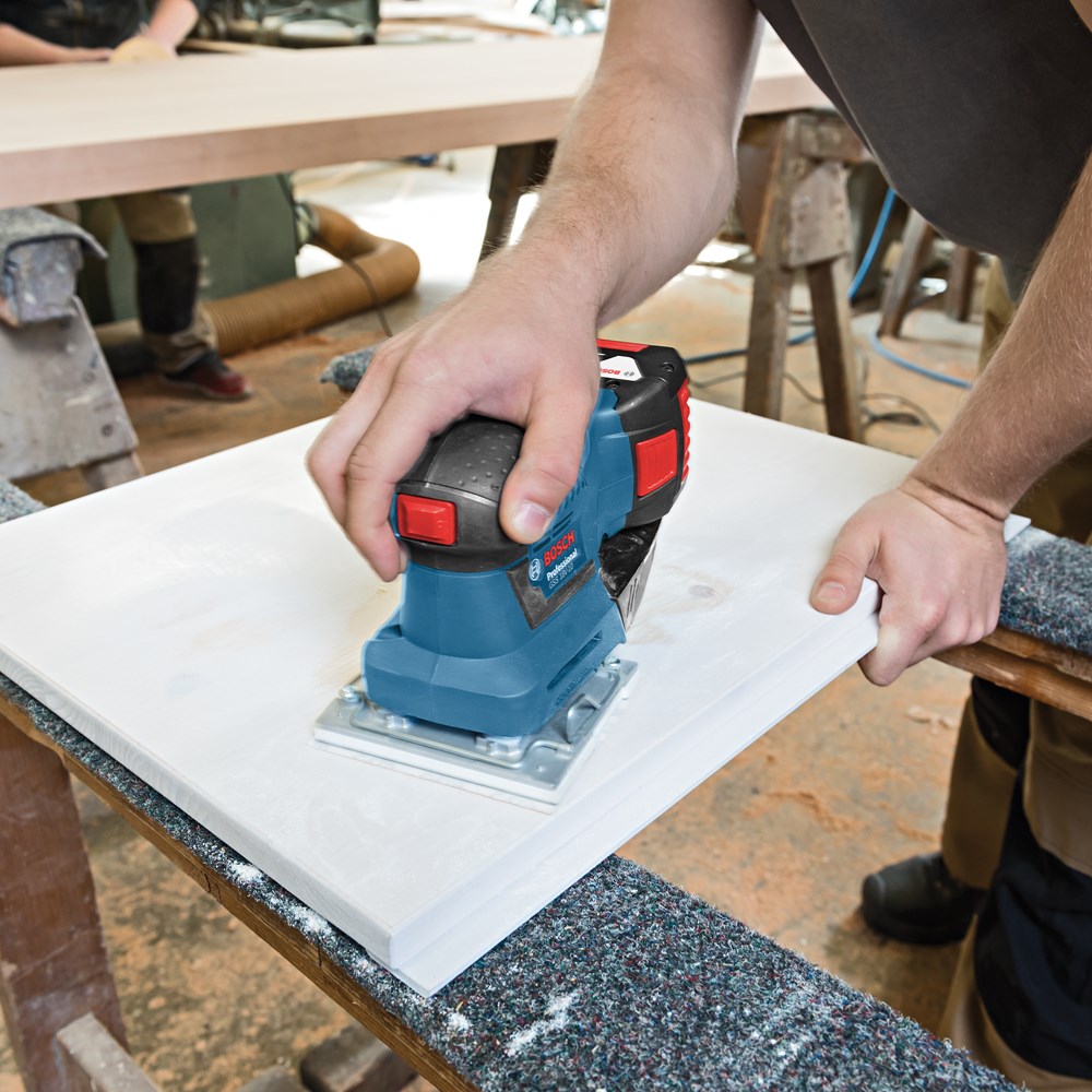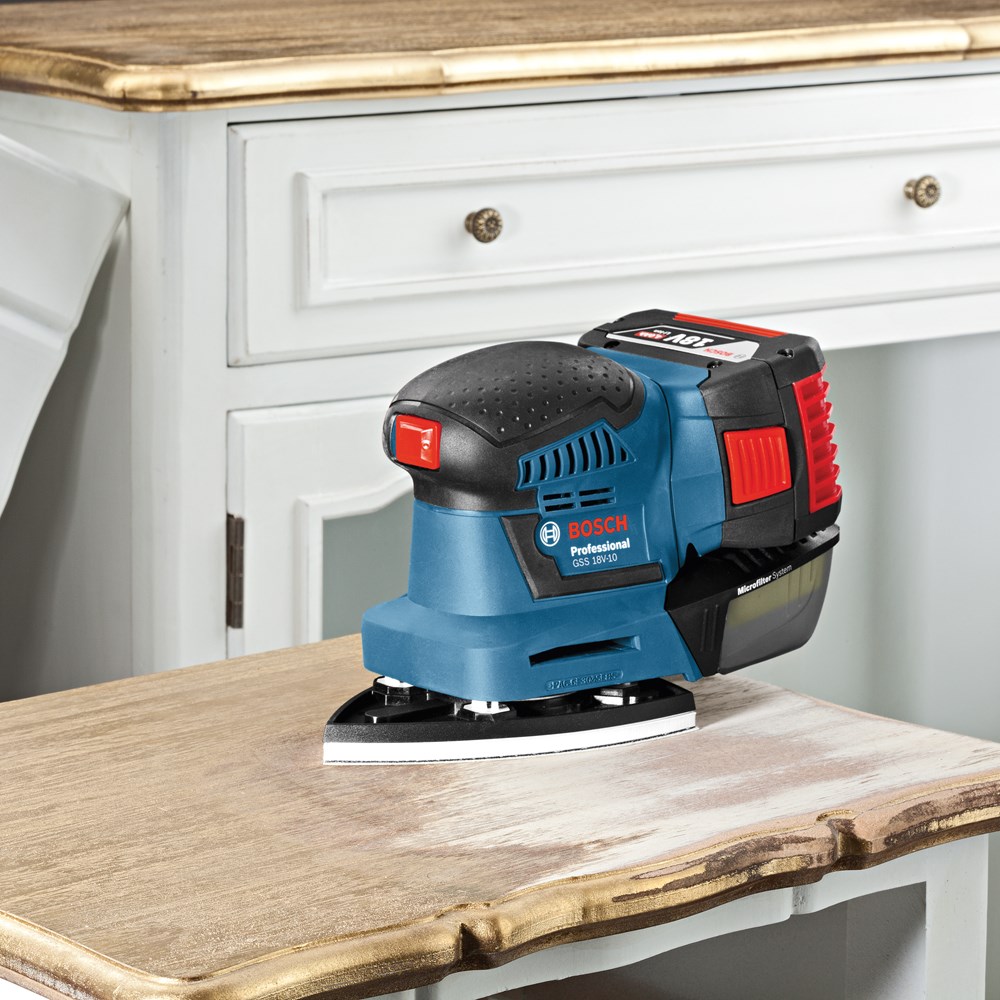 De Bosch GSS 18V-10 is een compacte en ergonomische accuvlakschuurmachine in de 18 V-klasse. De machine is voorzien van een ergonomische handgreep en een compact ontwerp voor makkelijk en comfortabel schuren. Een robuuste metalen plaat biedt duurzaamheid bij intensief gebruik. Het klemsysteem en de klithechting zorgen voor het eenvoudig aanbrengen en vervangen van schuurpapier.