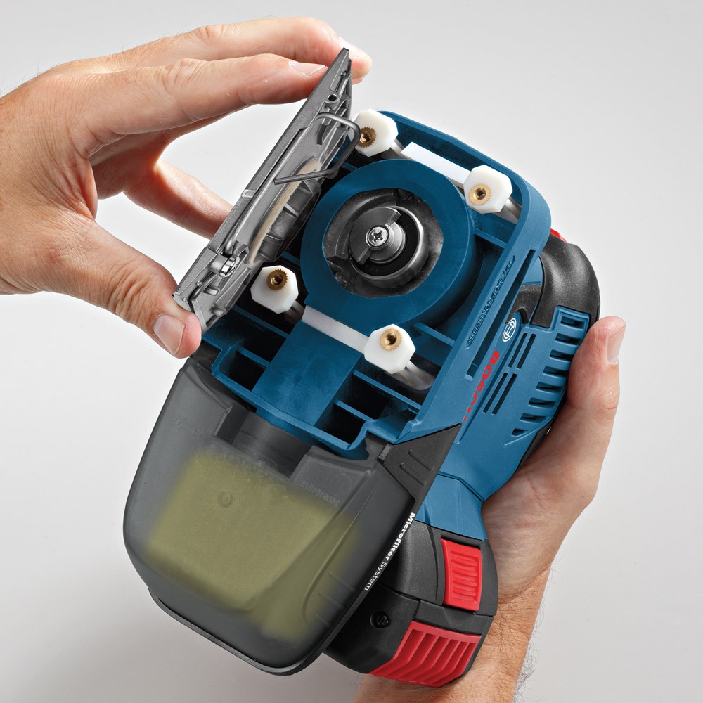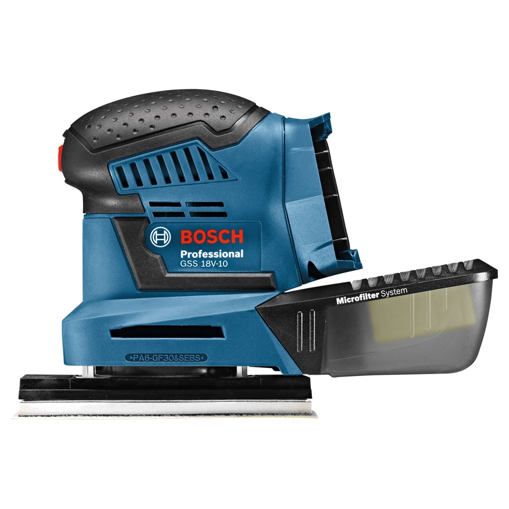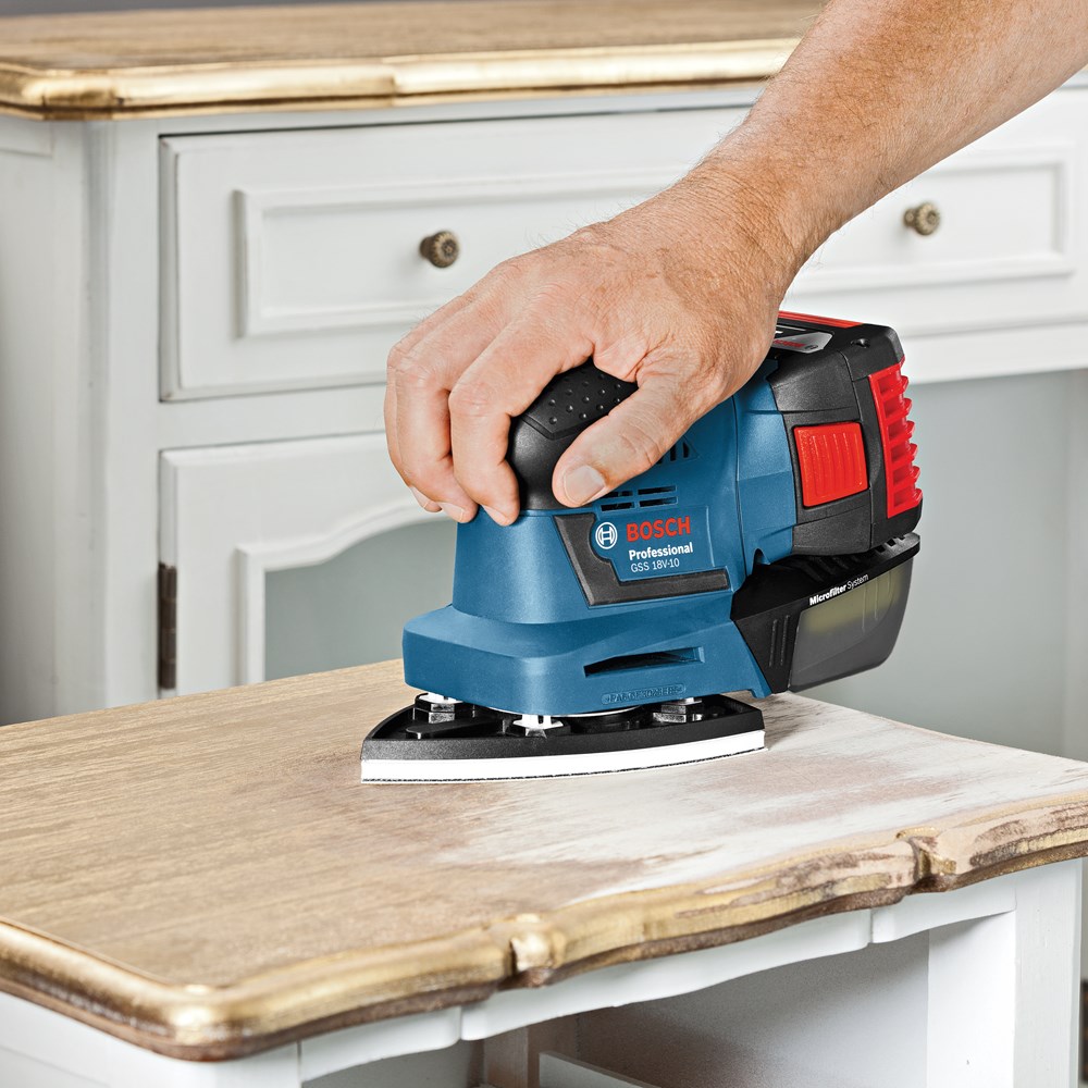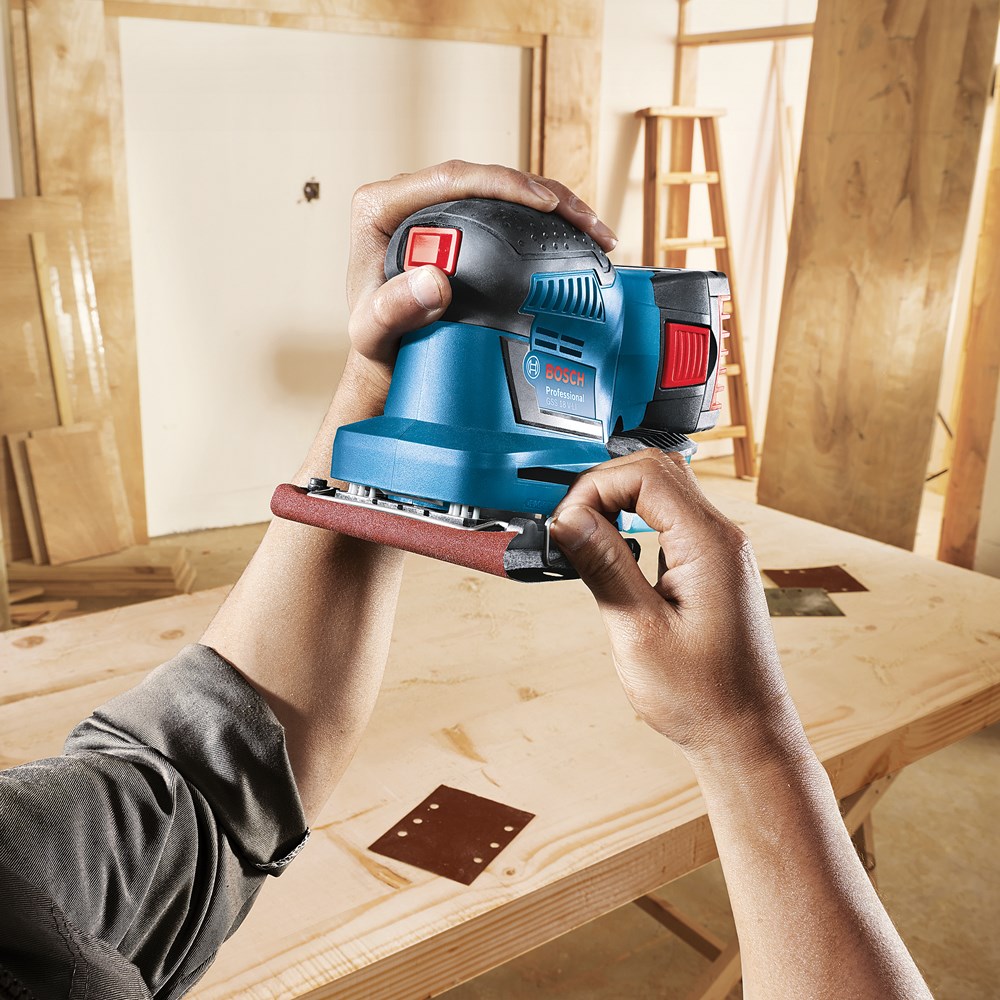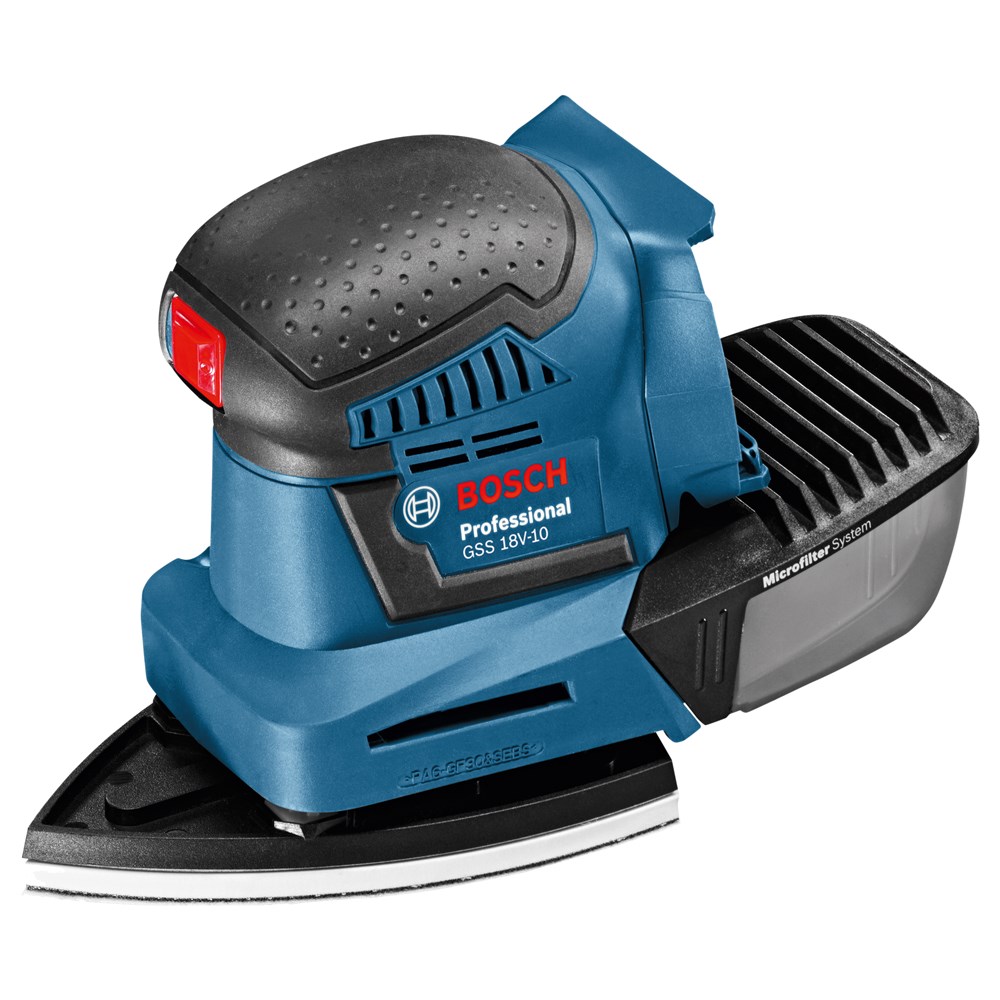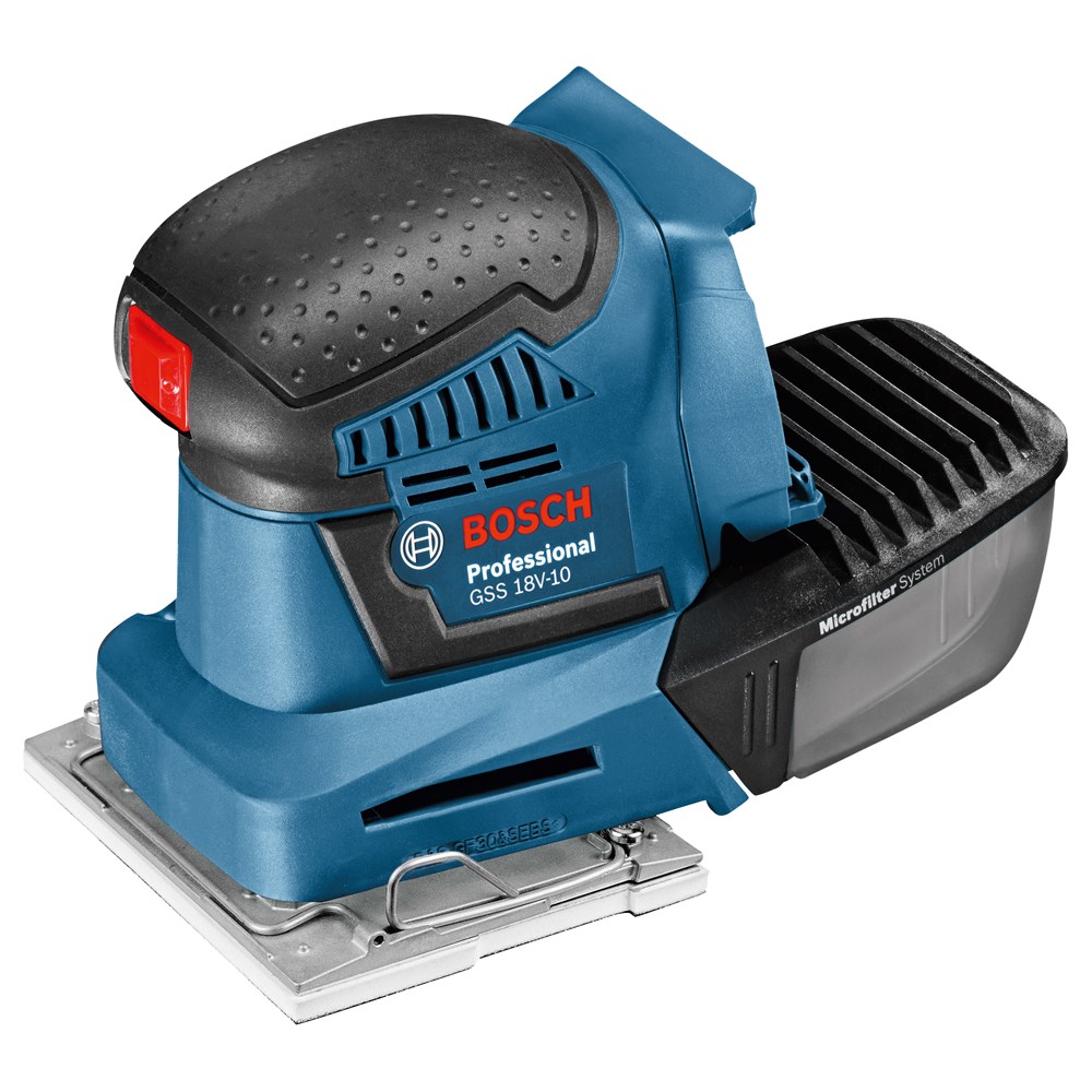 De Bosch GSS 18V-10 is een compacte en ergonomische accuvlakschuurmachine in de 18 V-klasse. De machine is voorzien van een ergonomische handgreep en een compact ontwerp voor makkelijk en comfortabel schuren. Een robuuste metalen plaat biedt duurzaamheid bij intensief gebruik. Het klemsysteem en de klithechting zorgen voor het eenvoudig aanbrengen en vervangen van schuurpapier.