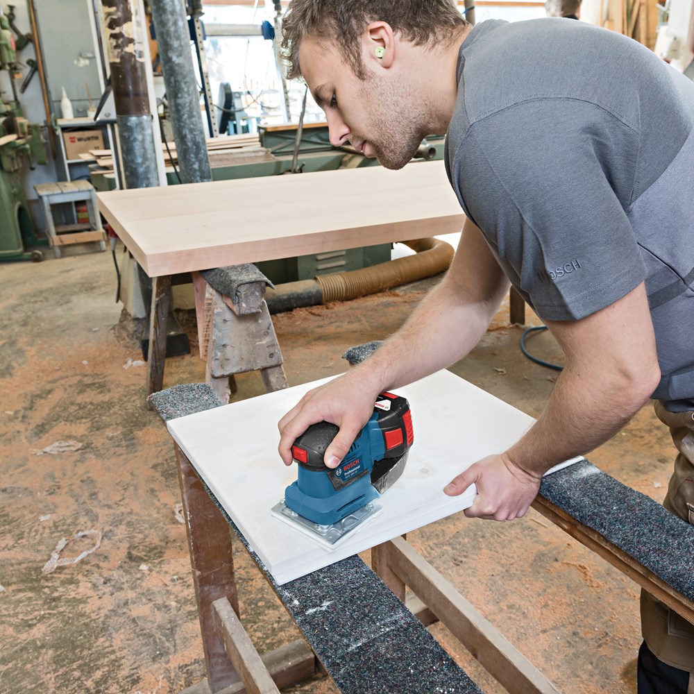 De excenterschuurmachine is bedoeld voor grof en fijn schuren en het afwerken van kleine vlakke oppervlakken. De machine kan worden gebruikt voor het schuren van hout, fineer, lak, vulmiddel evenals steen- en kunststofmaterialen. De machine is compatibel met het Bosch Click & Clean System.
