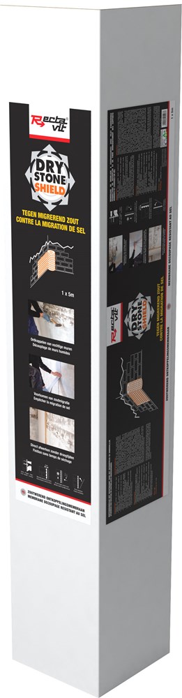 Contacteer onsTegen migrerend zout. Noppenmembraan voor het ontkoppelen en afwerken van vochtige en zoutbelaste binnenmuren. Het membraan verhindert contact tussen de muur en de nieuwe afwerkingslaag, waardoor deze onmiddellijk geplaatst kan worden. Het membraan kan geplaatst worden met behulp van de bijgeleverde boor en pluggen. Hoeken, naden en uitsparingen worden afgewerkt met Drystone Tape.