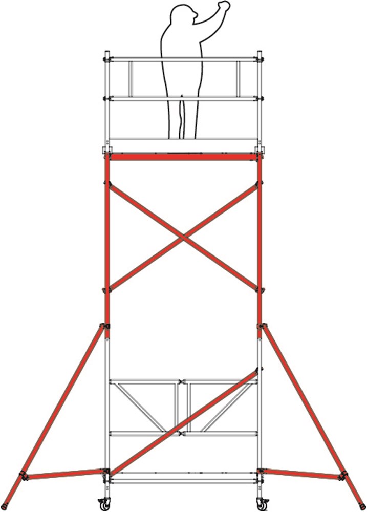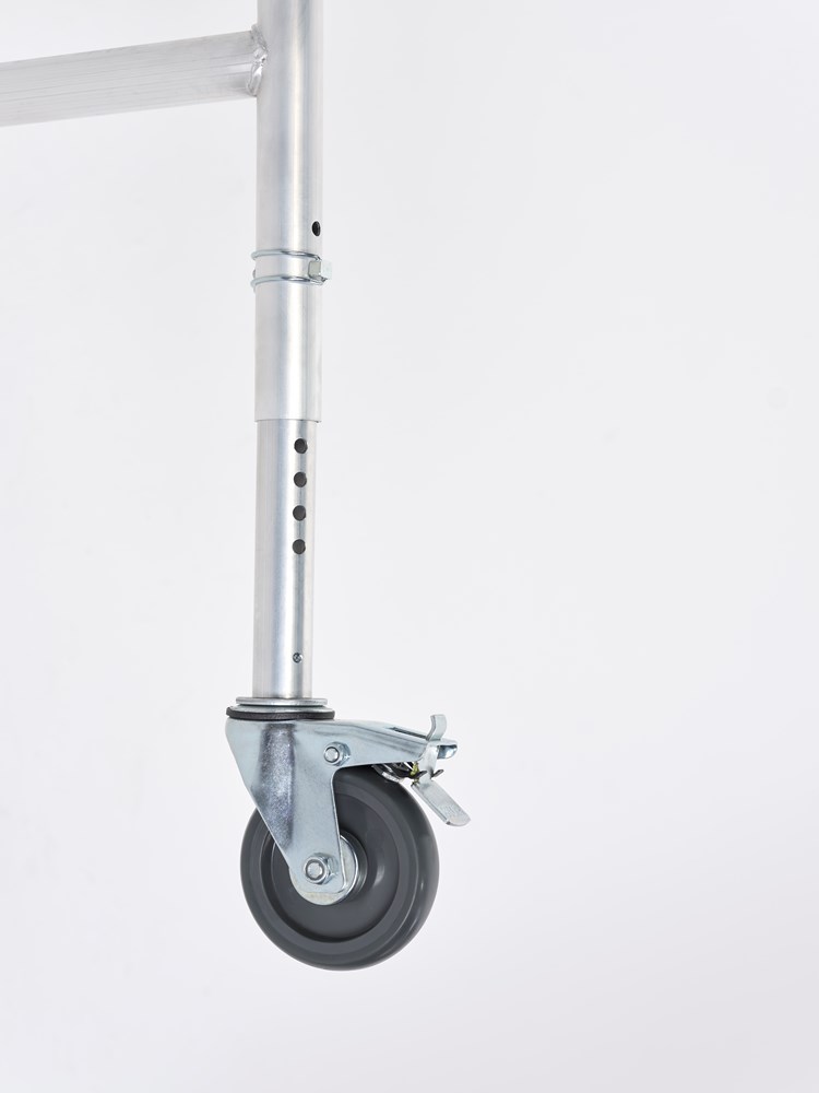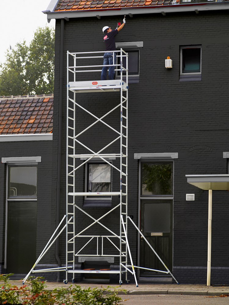 Modulair systeemMet Module 1 + 2 (werkhoogte 3,80 meter), Module 1 + 2 + 3 (werkhoogte 5,80 meter), Module 1 + 2 + 3 + 3 (werkhoogte 7,80 meter) bouw je de steiger tot grote hoogte.