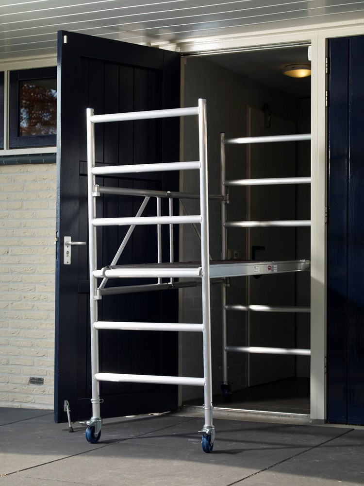 Door zijn smalle frames van 0,75 meter past hij door een deuropening. Het platform is verkrijgbaar in de lengte 1,65 meter. Met het vouwdeel in het frame van de steiger heb je weinig losse onderdelen en vouw je hem als geheel in elkaar. Zo neemt hij amper ruimte in.
