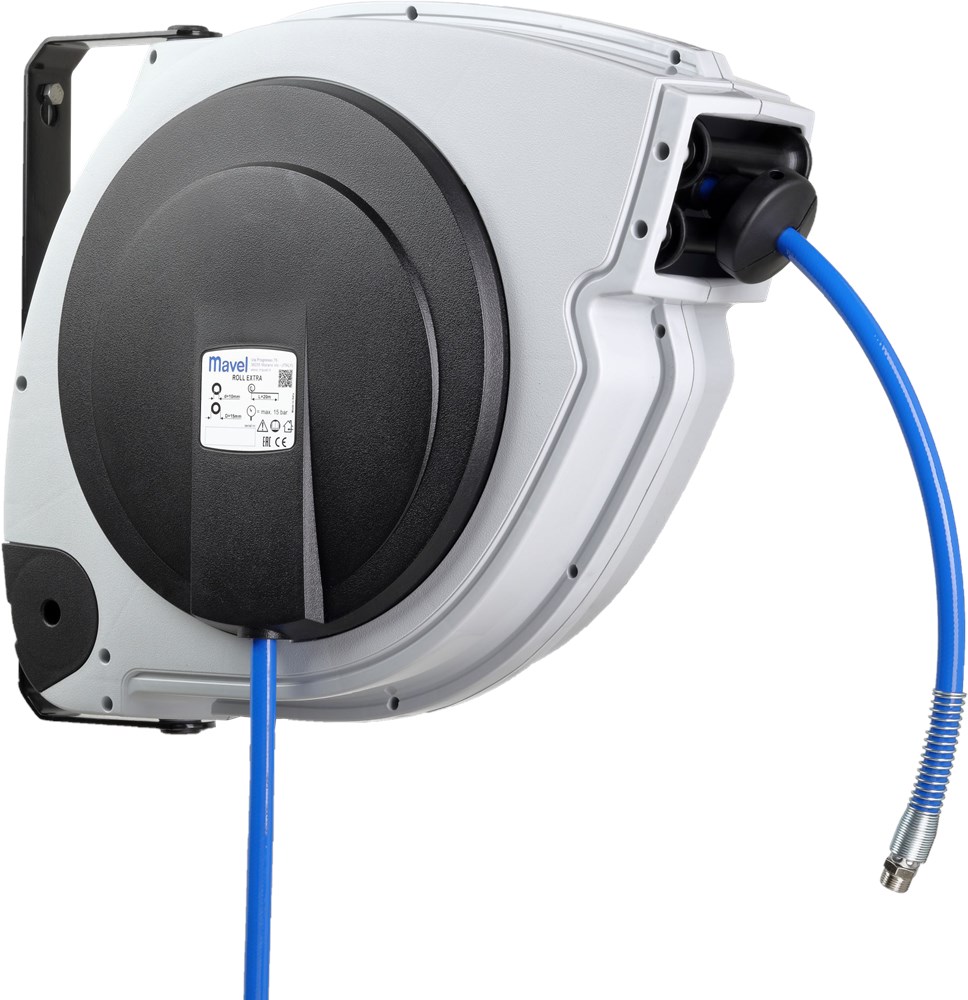Contacteer onsVeiligheids slanghaspel met geremde terugloop in kunstof behuizing met 15+1 meter PU persluchtslang (12x16mm) met een maximum werkdruk van 15 bar. Voorzien van 2 uitgangen van 1/2"