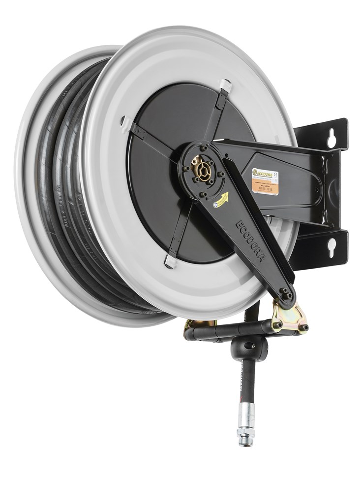 Contacteer onsVaste slanghaspel voor water en lucht met zwarte rubberen slang tot 70 graden celcius. Voorzien van een zelfoprollende slang met blokkering.