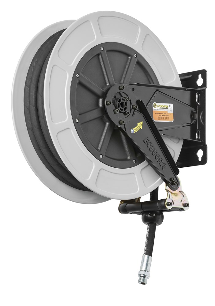 Contacteer onsVaste slanghaspel voor water en lucht met zwarte rubberen slang tot 70 graden celcius. Voorzien van een zelfoprollende slang met blokkering.