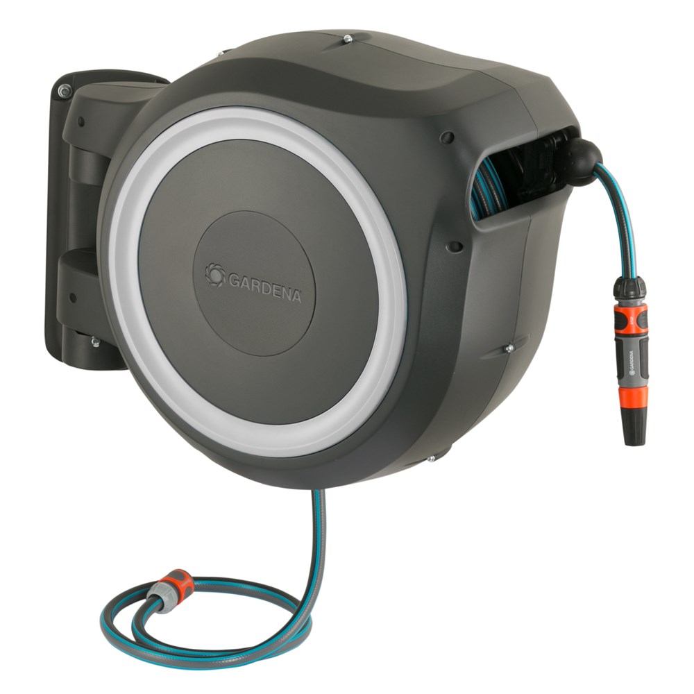 Contacteer onsDankzij het innovatieve ontwerp en de praktische oproltechnologie van de wandslangenbox RollUp M/L behoren omslachtig oprollen en geknikte slangen tijdens het bewateren tot het verleden. De wandslangenbox rolt de slang in een mum van tijd op en bergt de slang veilig en efficiënt op. De box wordt aan een muur bevestigd met een draaivoet van 180°. Deze beweegbare koppeling biedt maximale bewegingsvrijheid en een grote actieradius tijdens het bewateren. U kunt elke hoek van de tuin bereiken met de 25 meter lange kwaliteitsslang. De slang wordt moeiteloos afgerold door eraan te trekken en wordt automatisch op de gewenste lengte vergrendeld dankzij bijzonder korte vergrendelingspunten. Door voorzichtig te trekken komt de vergrendeling los en wordt de slang automatisch en betrouwbaar opgerold door een geïntegreerde veer. Om ervoor te zorgen dat de slang veilig en gecontroleerd wordt opgerold, maakt de wandslangenbox gebruik van innovatieve RollControl-technologie. De geïntegreerde slanggeleider zorgt ervoor dat de slang netjes en gelijkmatig wordt opgerold, zodat er geen knikken of knopen in de slang komen. De muurbeugel biedt ruimte aan diverse bewaterhulpstukken, die daar kunnen worden opgeborgen zodat de slangaccessoires altijd bij de hand zijn. Het hoogwaardige materiaal is bestand tegen UV en vorst. De slang wordt beschermd met diefstalbeveiliging, zodat deze altijd veilig is. Behalve de wandslangenbox bevat de box een muurbeugel, een aansluitslang, alle benodigde Original GARDENA System onderdelen en montageonderdelen en een mondstuk met twee verschillende sproeiopties. GARDENA geeft vijf jaar garantie op de wandslangenbox RollUp M/L.