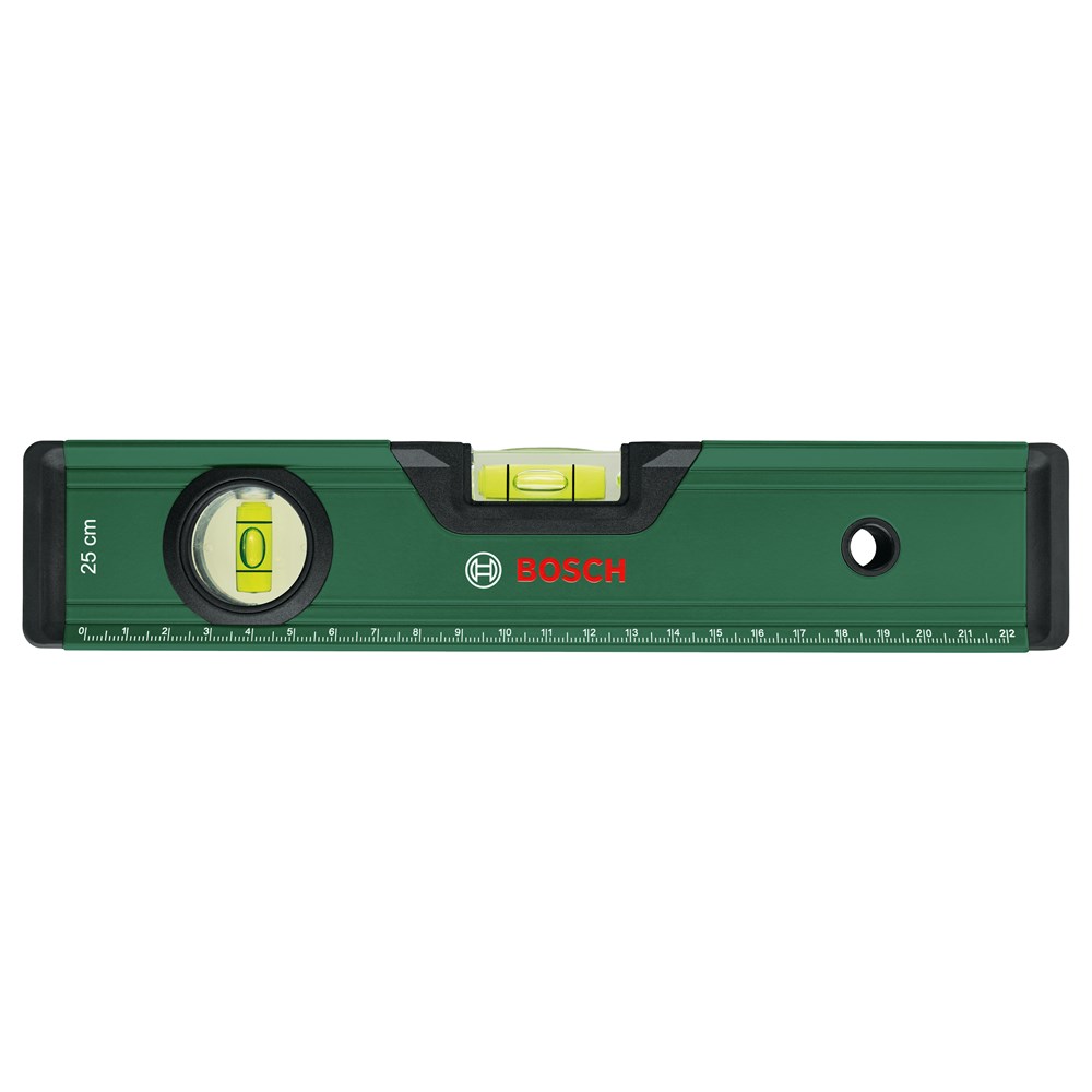Met de Bosch waterpas 25 cm hangen schappen en schilderijen in een mum van tijd recht. Deze praktische allrounder levert zeer accurate resultaten tot 0,05 mm/m dankzij horizontale en verticale libellen. Het aflezen van de waterpas is eenvoudig door de heldere, fluorescerende vloeistof in de libellen. Deze waterpas heeft een metrische schaalverdeling van 0 tot 22 cm, dus er hoeft geen tweede gereedschap erbij te worden gehaald aangezien deze ook dienst doet als liniaal. Zowel vlakke als gebogen oppervlakken kunnen worden uitgelijnd dankzij de V-groef en vlak gefreesde onderkant van de waterpas. Dit gereedschap is robuust: doe-het-zelfliefhebbers zullen de robuuste, lichte aluminium constructie, versterkte ribben, beschermende eindkappen met anti-slipvoorzieningen met softgrip evenals het praktische markeergat weten te waarderen, dat ook kan worden gebruikt voor ophangen en opbergen wanneer de klussen zijn geklaard.