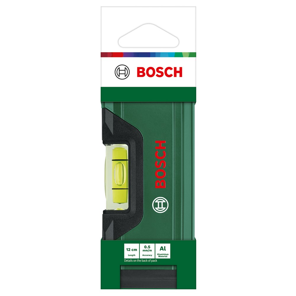De Bosch waterpas van 12 cm zorgt voor superieure nauwkeurigheid en gemak bij huishoudelijke nivelleerklussen. Dit stevige, lichte aluminium gereedschap met versterkte ribben glijdt gemakkelijk in een zak en is ideaal voor het meten op krappe of moeilijk bereikbare plaatsen. Doe-het-zelfliefhebbers zullen onder de indruk zijn van de functies die ten grondslag liggen aan de nauwkeurigheid van 0,05 mm/m en veelzijdigheid van deze waterpas: een vlak gefreesde onderkant met V-groef voor het meten van platte of gebogen oppervlakken, beschermende eindkappen met softgrip glijstoppen voor betere bescherming en stabiliteit en een fijn gekalibreerde, gemakkelijk af te lezen fluorescerende horizontale libel.